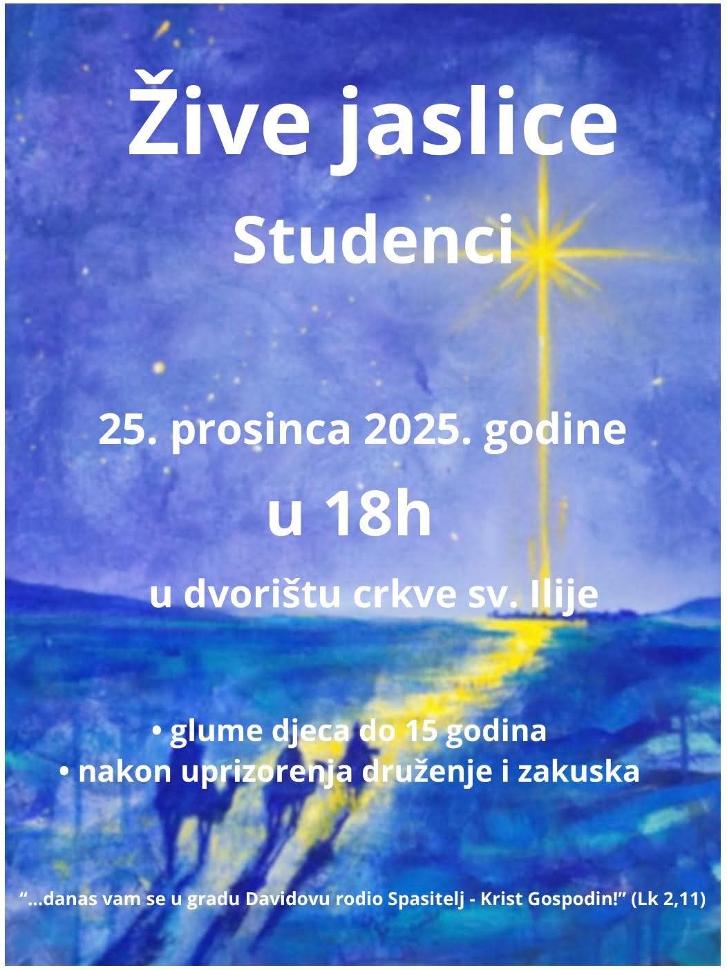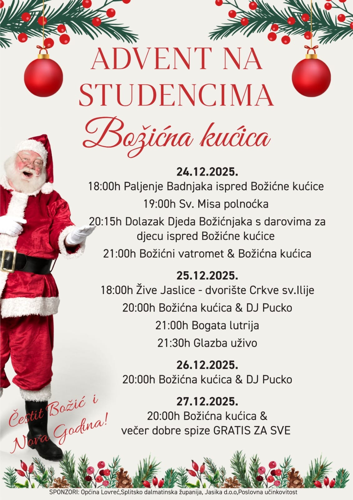 Na Božić, 25. prosinca, u 18 sati održat će se žive jaslice u dvorištu crkve sv. Ilije. Zabavni dio programa nastavlja se od 20 sati uz Božićnu kućicu i DJ-a Pucka, bogatu lutriju u 21 sat te glazbu uživo od 21:30.