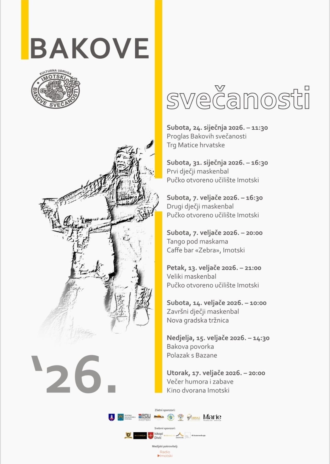 Kulturno društvo Bakove svečanosti i ove je godine pripremilo bogat program pokladnih svečanosti u Imotskom. Poklade se u gradu Imotskom organiziraju preko 150 godina, a njihova posebnost je što je Bakova povorka jedini događaj takve vrste u Hrvatskoj u kojemu se njeguje kult Bacchusa - rimskoga boga vina, veselja i hrane.