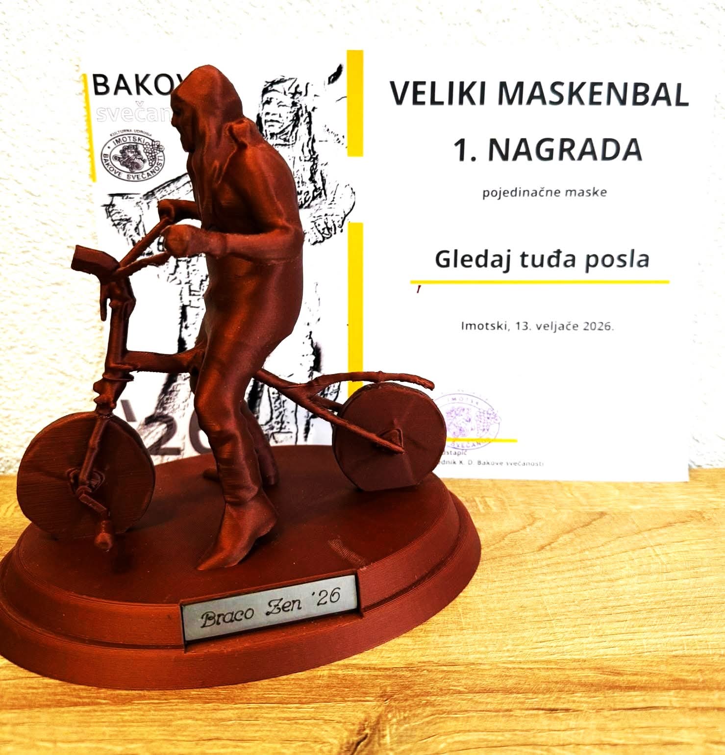 U sklopu ovogodišnje karnevalske povorke, u kategoriji pojedinačnih maski, prvo mjesto i prvu dodijeljenu nagradu „Braco Zen“ osvojila je maska „Gledaj tuđa posla“, iza koje stoje dvije mlade Imoćanke, Matea Đulmez i Anamari Babić. Uvođenjem ove nagrade organizatori su željeli trajno sačuvati uspomenu na Josipa Bracu Zena te dodatno potaknuti kreativnost i originalnost sudionika, naglašavajući važnost očuvanja bogate pokladne tradicije Imotskoga.