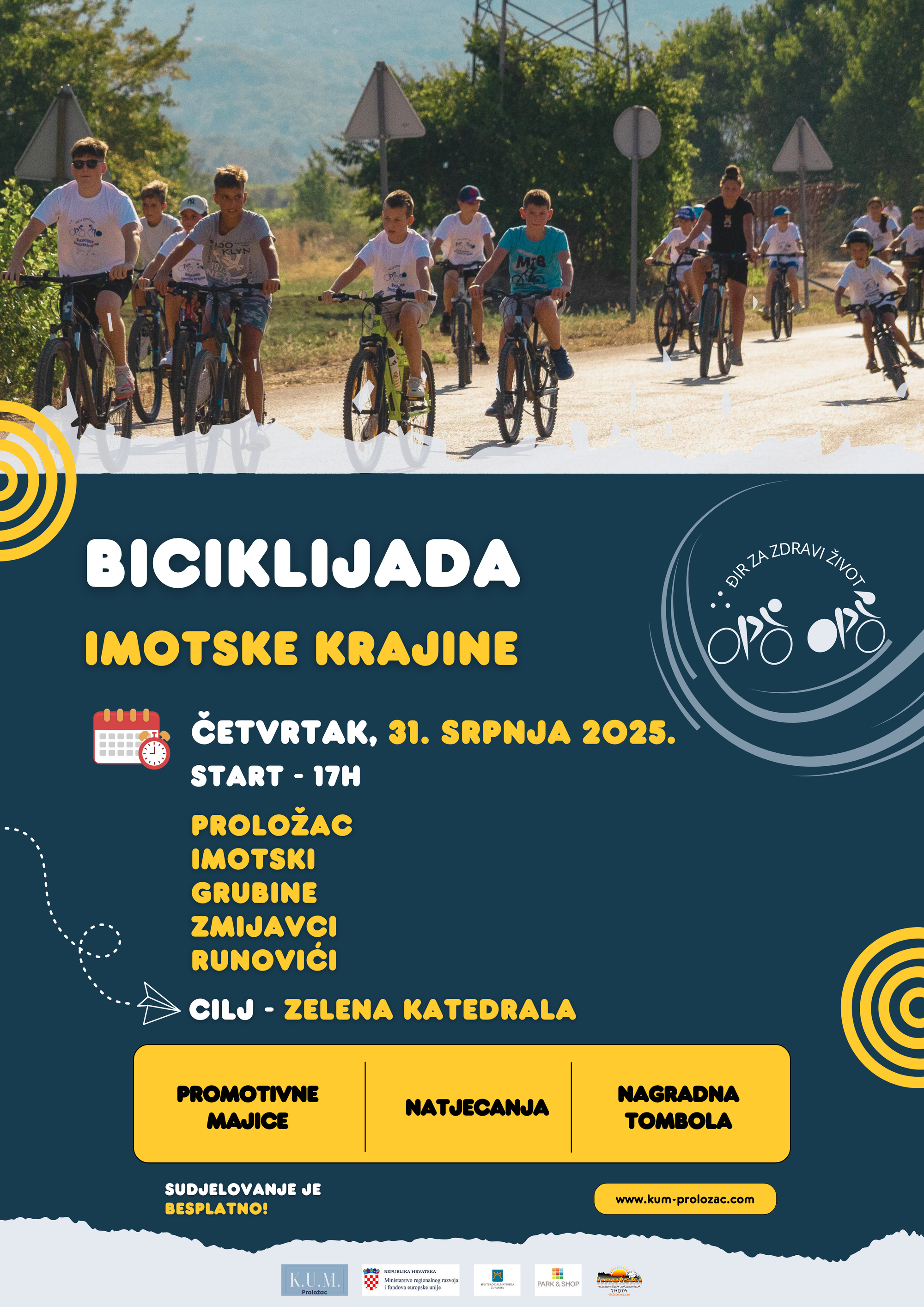 Humanitarna biciklijada Imotske krajine „Đir za zdravi život“ u organizaciji udruge K.U.M. Proložac održava se u četvrtak, 31.07.2025. sa startnih pozicija u Prološcu, Imotskom, Grubinama, Zmijavcima i Runovićima. Biciklijada i ove godine ima svoj humanitarni karakter u suradnji s imotskim Crvenim križem, za koji se prikupljaju donacije na račun otvoren za posebne namjene - HR4423400091511292611