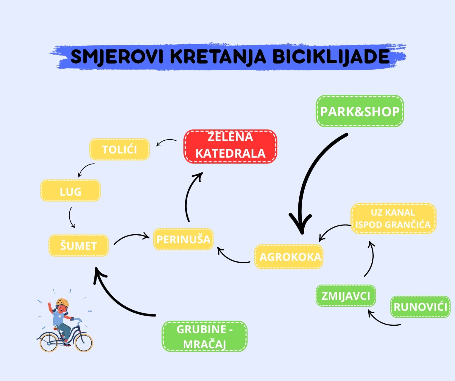 Sudionici biciklijade nakon zabavnog i ne preteškog bicikliranja okupljaju se na Perinuši odakle biciklistička kolona zajednički kreće prema Zelenoj katedrali gdje će biti organiziran zabavni program uz nagradnu tombolu i glavnu nagradu bicikl, igre za najmlađe sudionike, hranu i piće. Važno je napomenuti i kako je biciklijada fizički ne zahtjevna te da sudjelovati mogu i najmlađi, ali i oni malo stariji, svi koji znaju upravljati vozilom na dva kotača. Detaljne upute će biti objavljene na web stranici i facebook stranici organizatora udruge K.U.M. Proložac. Promet će biti reguliran uz pomoć i pratnju policije, a samoj organizaciji pripomoći će brojni volonteri.
