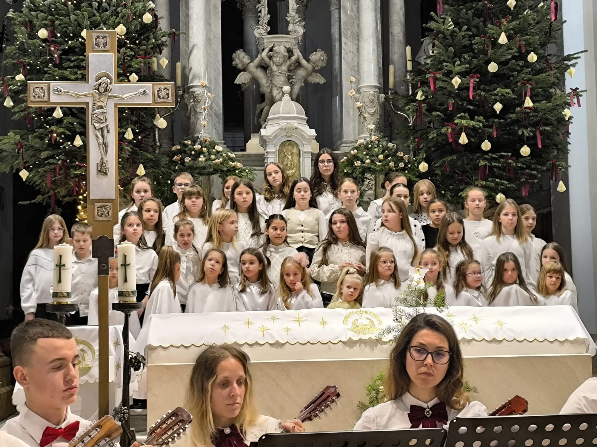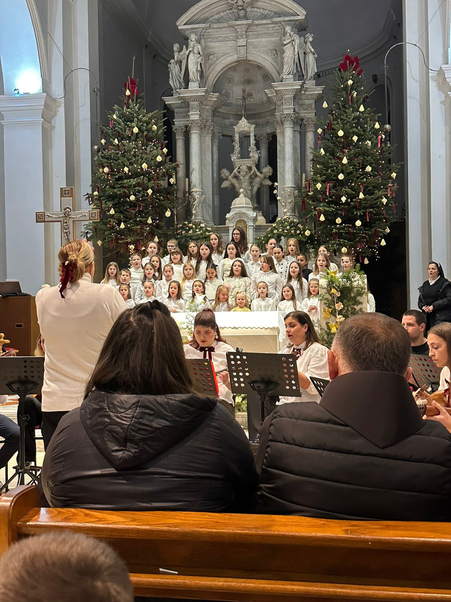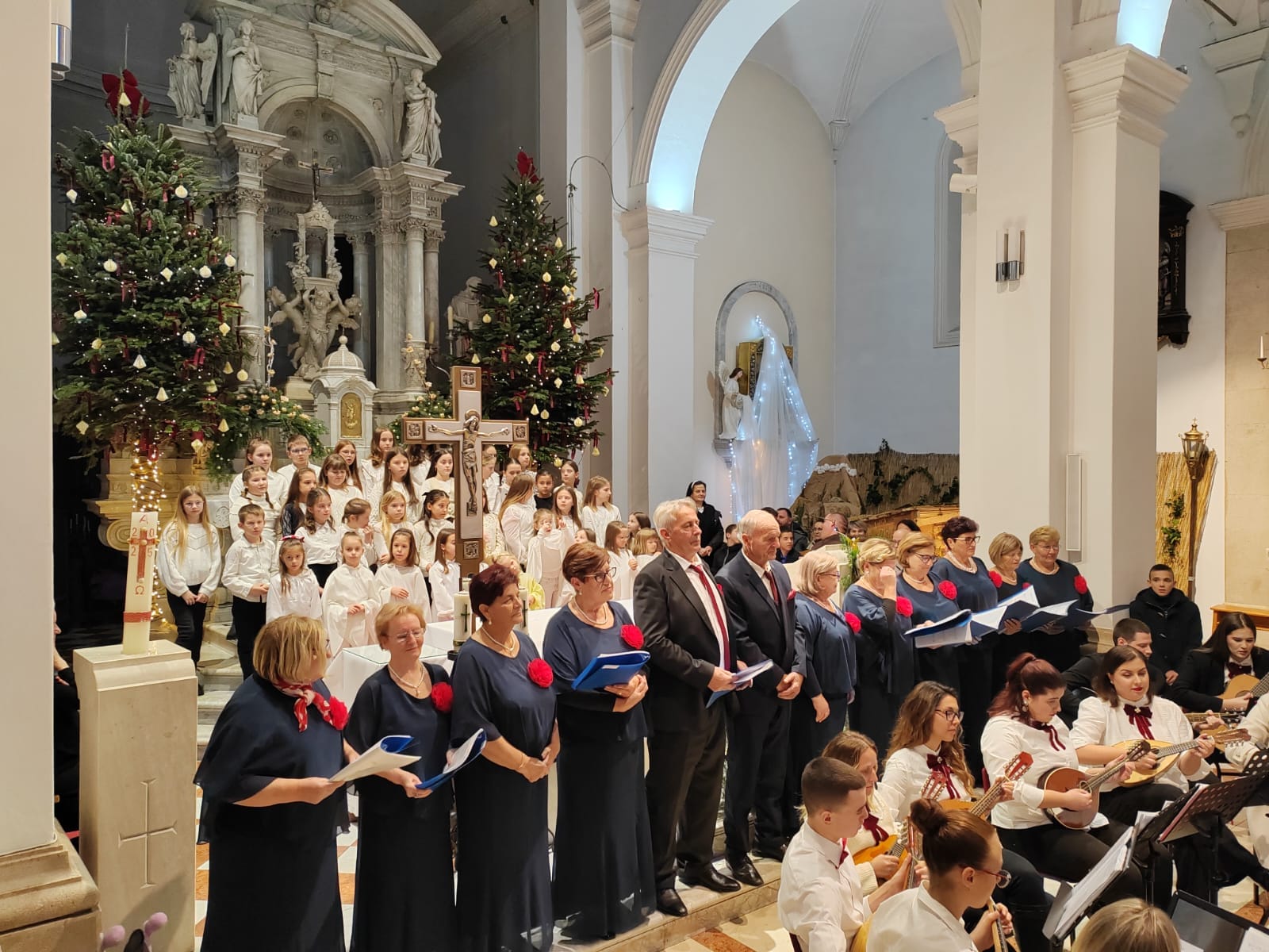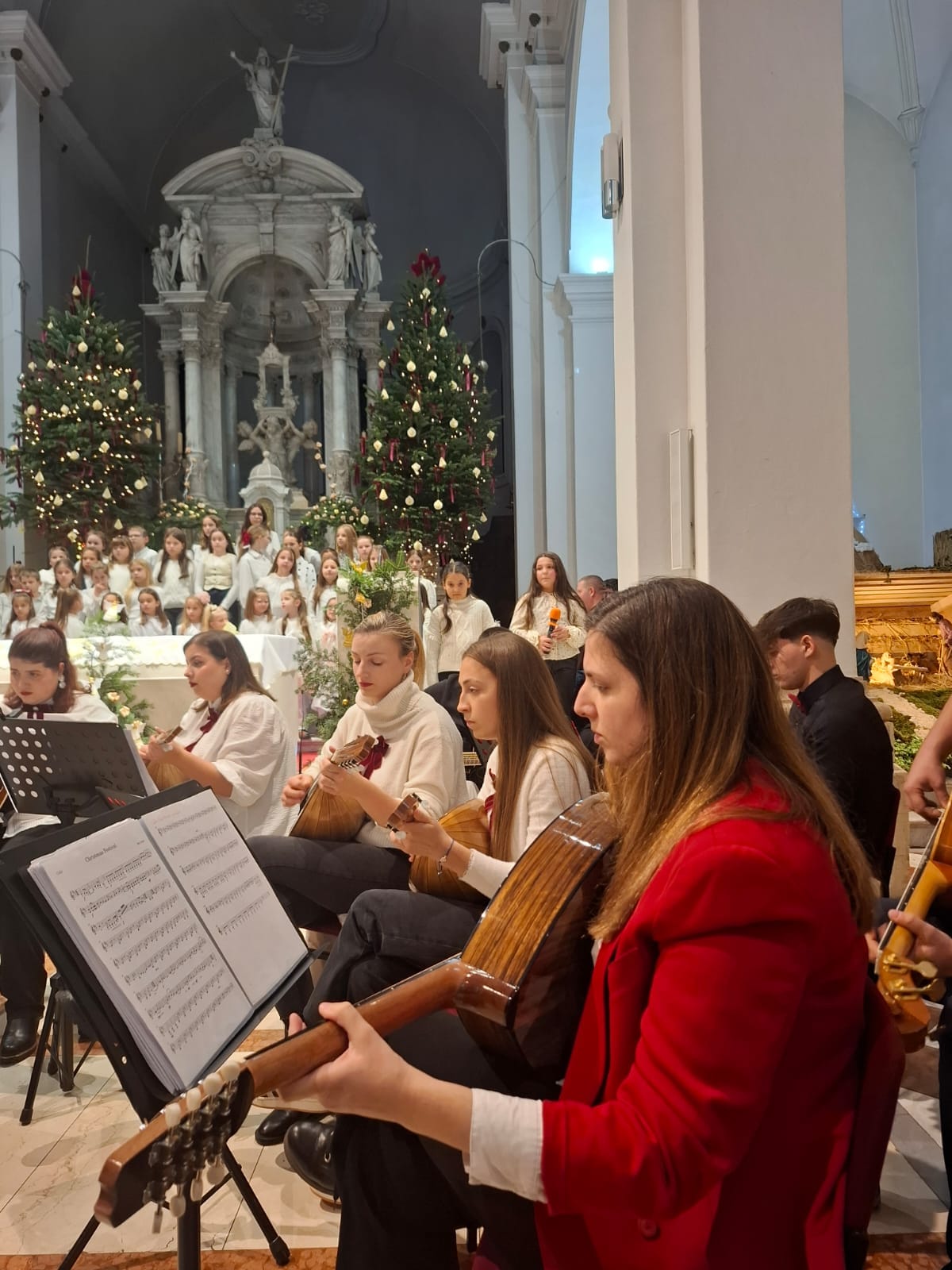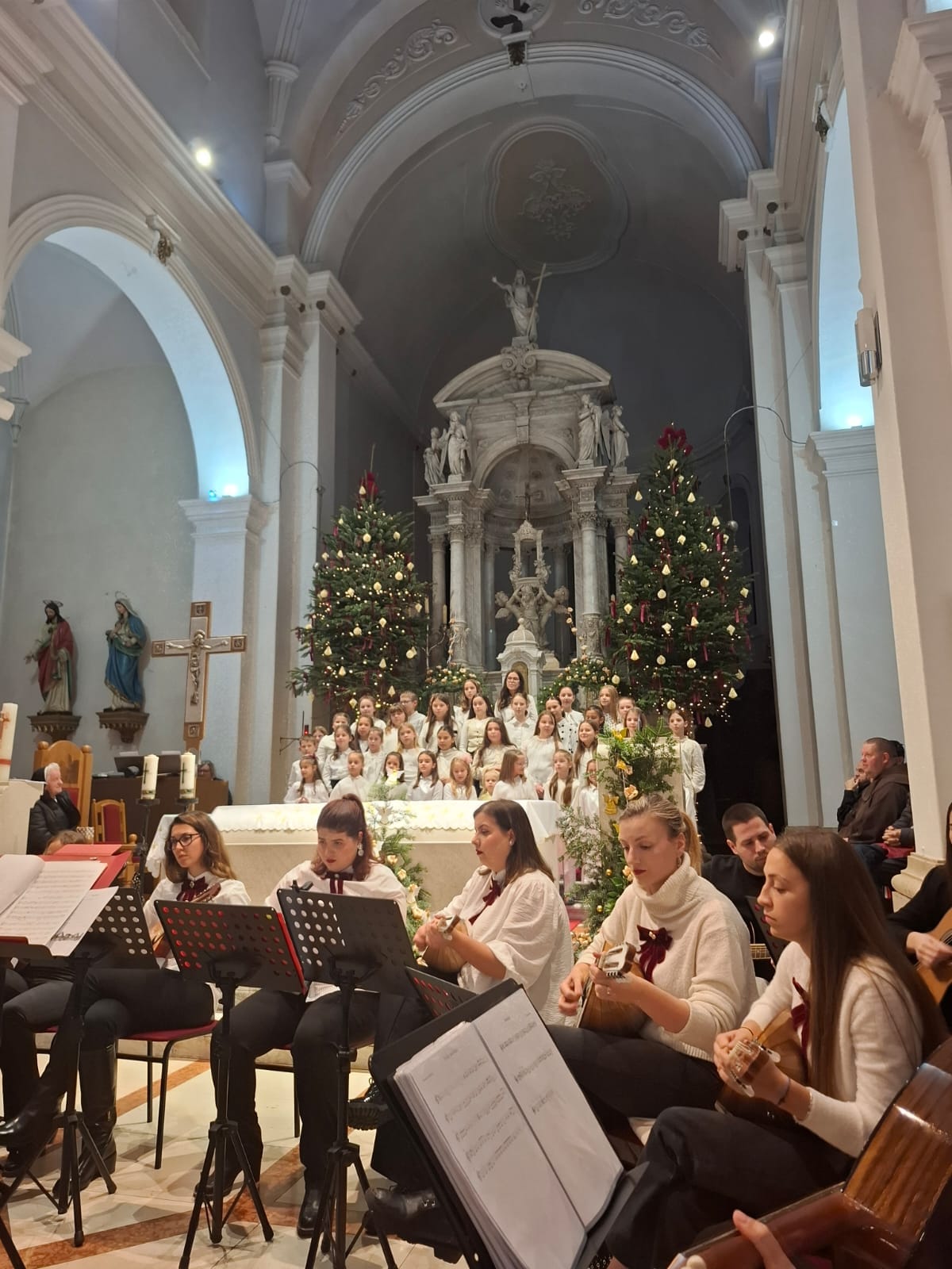 Crkva sv. Frane u Imotskom sinoć je na blagdan sv. Obitelji i Nevine dječice, bila ispunjena do posljednjeg mjesta na tradicionalnom božićnom koncertu koji je i ove godine okupio brojne Imoćane i njihove goste. U posebnom blagdanskom ozračju, ispod svodova okićene crkve, zajednički su nastupili Mandolinski orkestar Imotski, dječji zbor Gospini anđeli te zbor umirovljenika Imotske krajine, priredivši publici večer za pamćenje. Već s prvim taktovima božićnih skladbi osjetila se toplina i emocija koje su ispunile prostor crkve. Program je bio pažljivo osmišljen kako bi obuhvatio tradicionalne božićne pjesme, ali i skladbe koje su publiku potaknule na aktivno sudjelovanje. Mnogi su se bez zadrške pridružili pjevanju, pretvarajući koncert u istinsko zajedničko slavlje Božića. Posebnu vrijednost koncertu dao je spoj mladih i starijih izvođača. Dječji glasovi zbora Gospini anđeli donijeli su radost i vedrinu, dok su iskusni članovi zbora umirovljenika Imotske krajine svojim nastupom podsjetili na snagu tradicije i zajedništva koje se godinama njeguje. Mandolinski orkestar Imotski sve je povezao u skladnu cjelinu, dodatno obogaćujući zvuk i ugođaj večeri. Publika je izvođače nagradila dugotrajnim pljeskom, a brojni posjetitelji nisu skrivali oduševljenje viđenim i doživljenim. U vremenu kada se rijetko uspijeva okupiti toliki broj ljudi na jednom mjestu, ovaj koncert još je jednom pokazao koliko su ovakvi događaji važni za kulturni i društveni život grada. Božićni koncert u crkvi sv. Frane tako je i ove godine bio mnogo više od glazbenog događaja – bio je susret generacija, zajednička molitva kroz pjesmu i, kako su mnogi istaknuli, najljepša čestitka Imotskom za Božić i nadolazeću 2026. godinu.