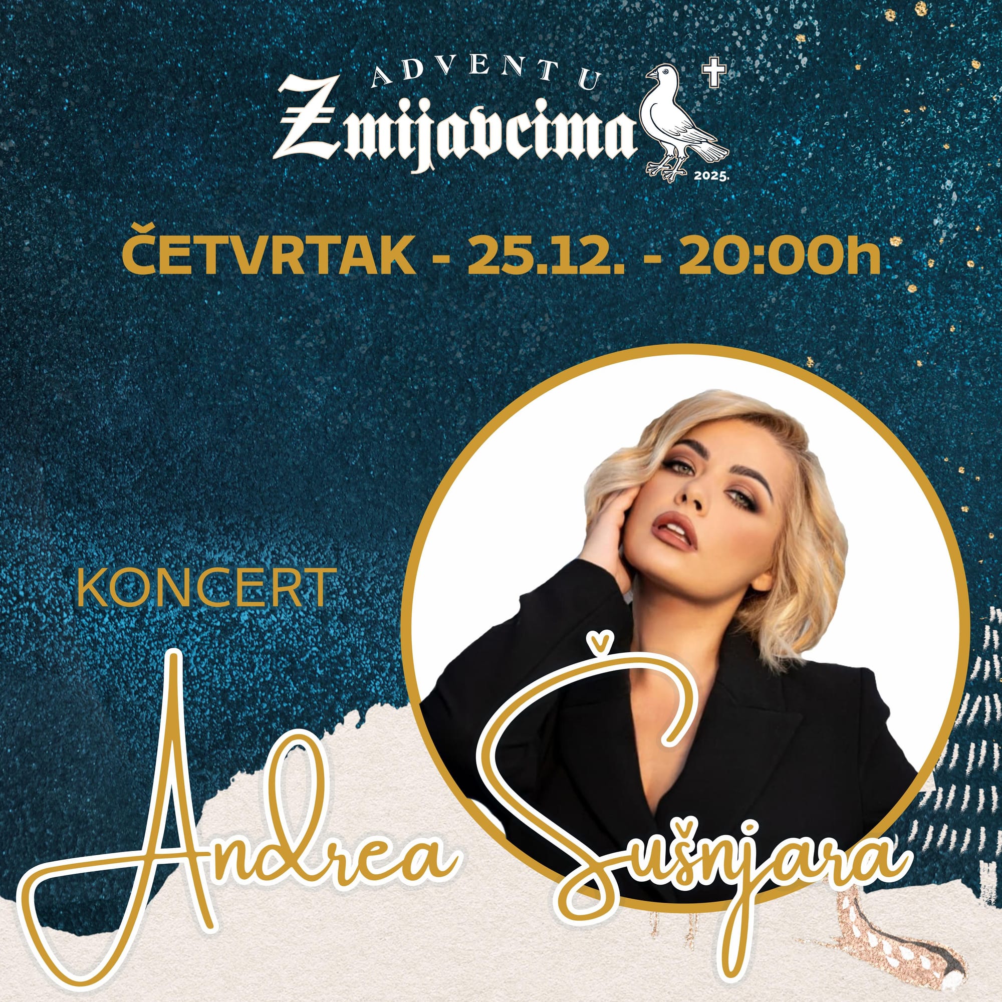 Na Božić, u sklopu Adventa u Zmijavcima od 20 sati, očekuje vas poseban glazbeni događaj – koncert Andree Šušnjare. Popularna pjevačica svojim će nastupom dodatno uljepšati blagdansku večer i donijeti pravu božićnu atmosferu.