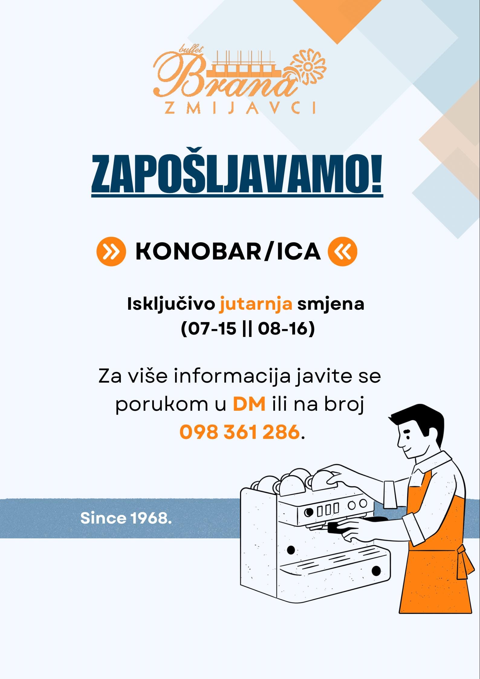 Buffet Brana Zmijavci, s tradicijom dugom još od 1968. godine, zapošljava konobara/icu za rad u svom ugostiteljskom objektu.