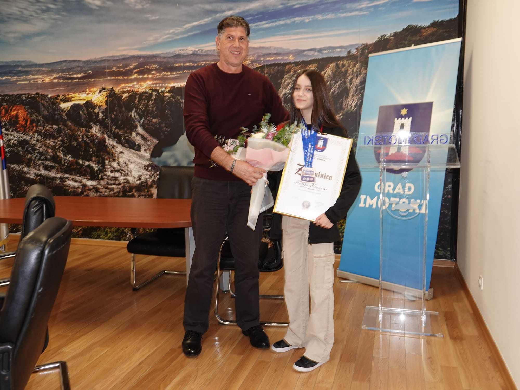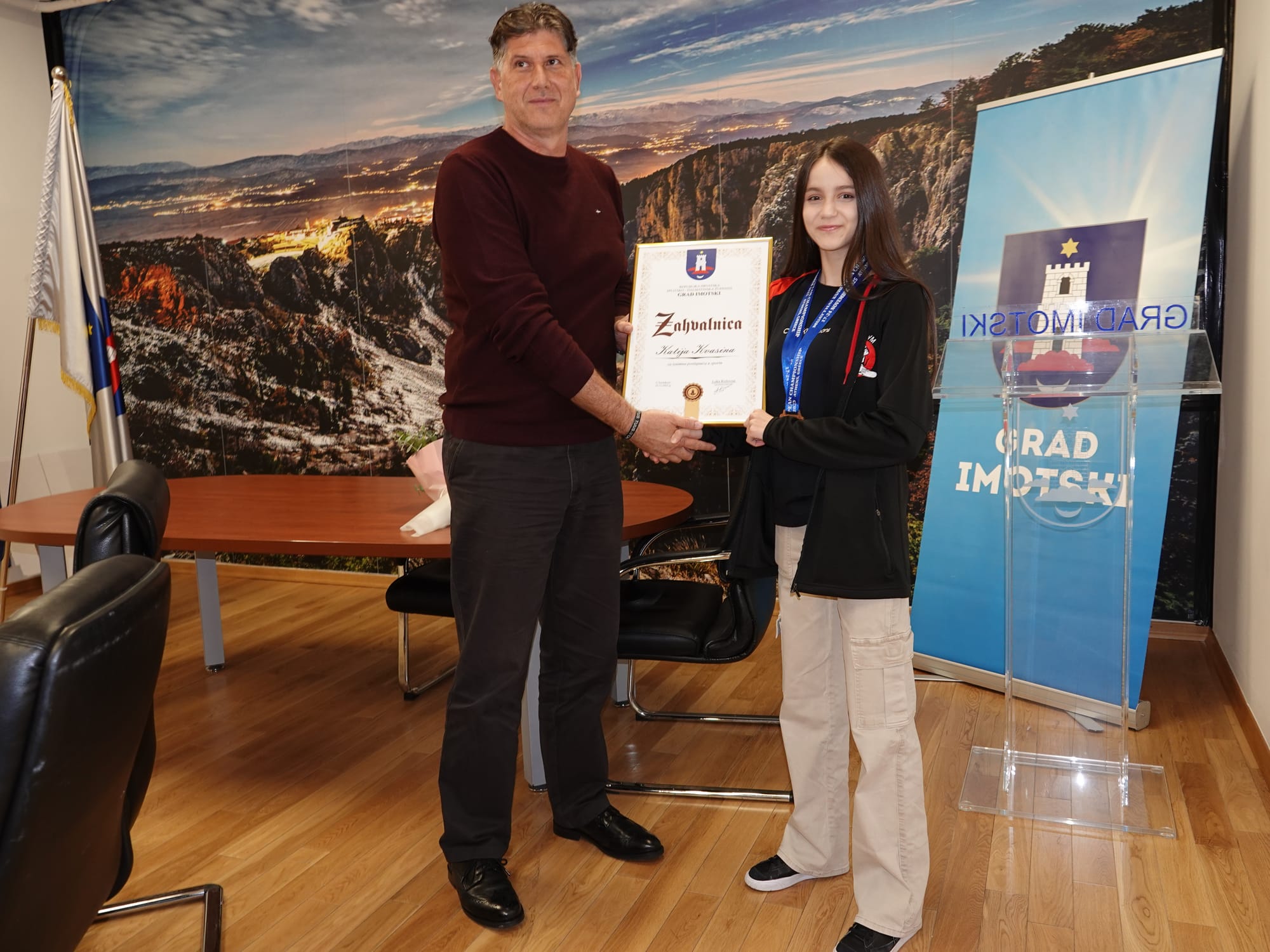 U srijedu je u gradskoj vijećnici gradonačelnik Luka Kolovrat upriličio prijem za mladu imotsku sportašicu Katiju Kvasinu, članicu Kluba tajlandskog boksa Imotski, koja je nedavno ostvarila izniman uspjeh na Europskom prvenstvu u tajlandskom boksu osvojivši brončanu medalju u kategoriji juniorki do 42 kilograma. Na prijemu je sudjelovao i njezin trener Frane Kutleša, pod čijim je vodstvom Katija ostvarila ovaj vrijedan sportski rezultat.