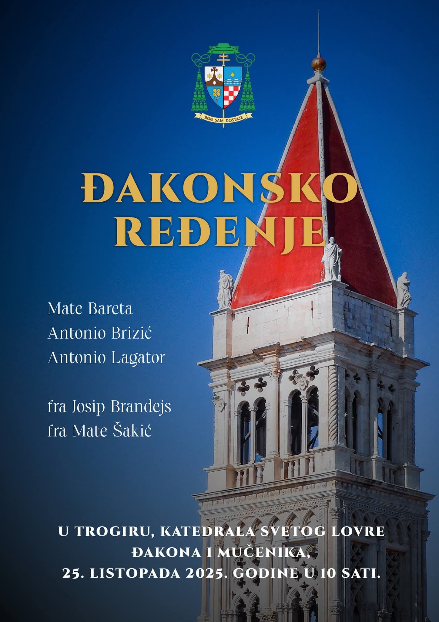 U subotu 25. listopada 2025. godine u Trogiru, s početkom u 10 sati u katedrali svetog Lovre, đakona i mučenika, mons. Zdenko Križić, splitsko makarski nadbiskup i metropolit podijelit će red đakonata, trojici kandidata na naslov Splitsko-makarske nadbiskupije i to Mate Bareta, Antonio Brizić, Antonio Lagator i dvojici kandidata na naslov Franjevačke provincije Presvetog Otkupitelja sa sjedištem u Splitu, fra Josipu Brandejsu i fra Mati Šakiću.