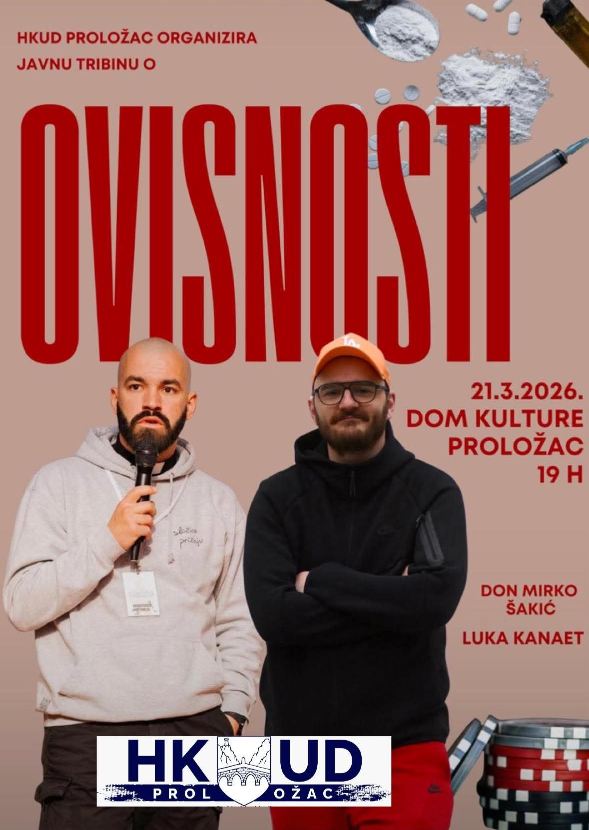 U Prološcu će se u subotu, 21. ožujka, održati javna tribina posvećena temi ovisnosti, jednom od važnijih društvenih izazova današnjice. Tribina će započeti u 19 sati u Domu kulture Proložac, a o ovoj temi govorit će don Mirko Šakić te Luka Kanaet, predsjednik Udruge Sličice pričaju. Organizatori iz Hkud-a Proložac pozivaju sve zainteresirane građane da se odazovu i sudjeluju u otvorenom razgovoru o problemu ovisnosti, ističući kako je riječ o temi koja se tiče cijelog društva te zahtijeva zajednički pristup i podršku zajednice. Generalni pokrovitelj tribine je Općina Proložac. Tijekom događanja u dvorani će biti postavljena i kutija za pomoć malom Marku Cvitanoviću, kako bi svi koji žele mogli dati svoj doprinos i podršku.