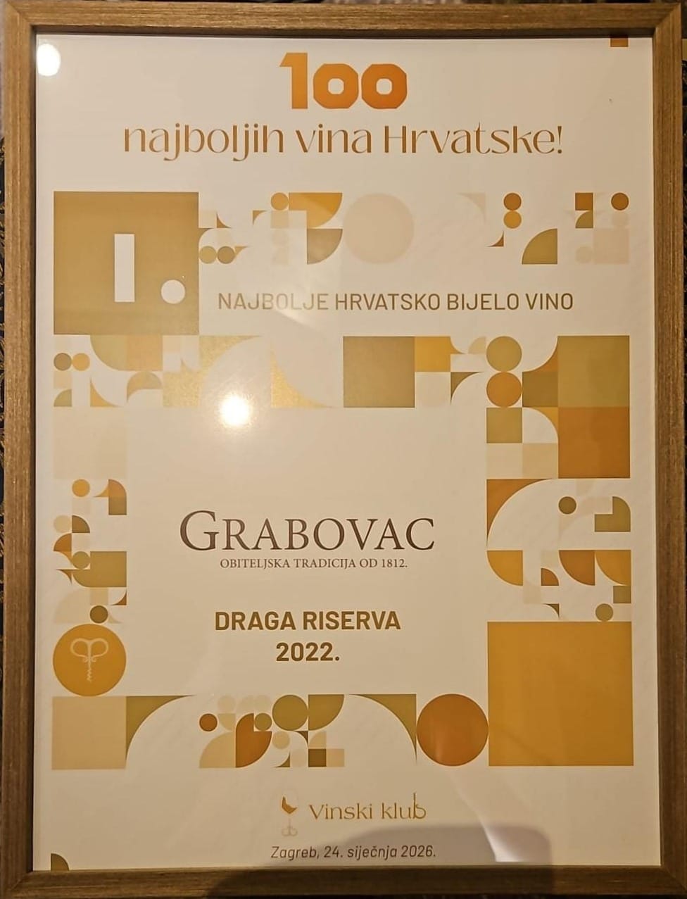 Danas je u Sheraton Zagreb Hotelu održano treće izdanje festivala 100 najboljih vina Hrvatska na kojem je svoja vina izlagala i Vinarija Grabovac te je ostvarila izniman uspjeh. Njihovo vino Draga Riserva - berba 2022. postalo je najbolje bijelo vino u Hrvatskoj.