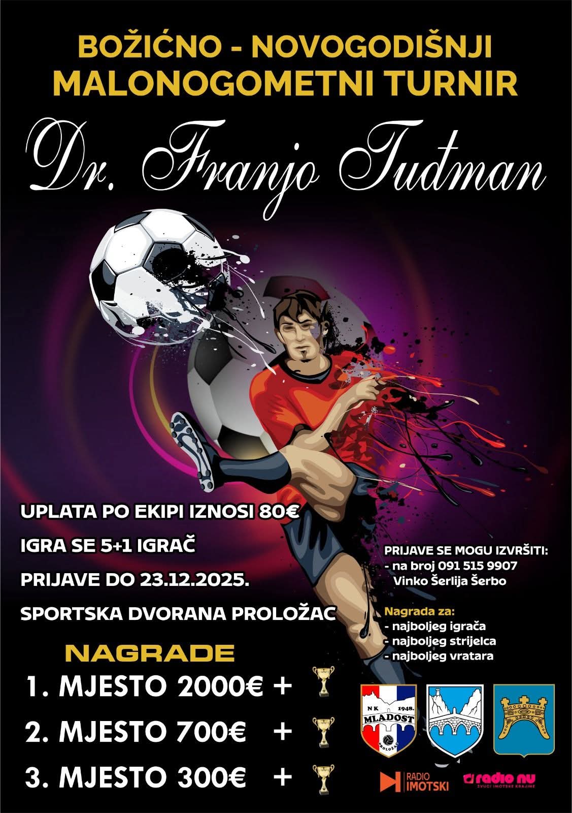 Općina Proložac i NK Mladost Proložac organiziraju božićno-novogodišnji malonogometni turnir dr. Franjo Tuđman. Turnir će se odigravati u sportskoj dvorani u Prološcu od 27. prosinca do 12. siječnja 2026. godine.