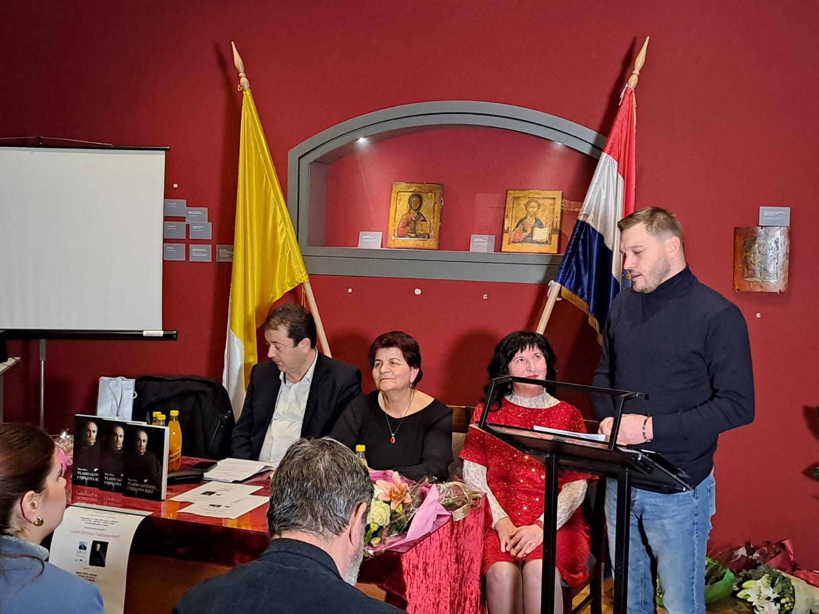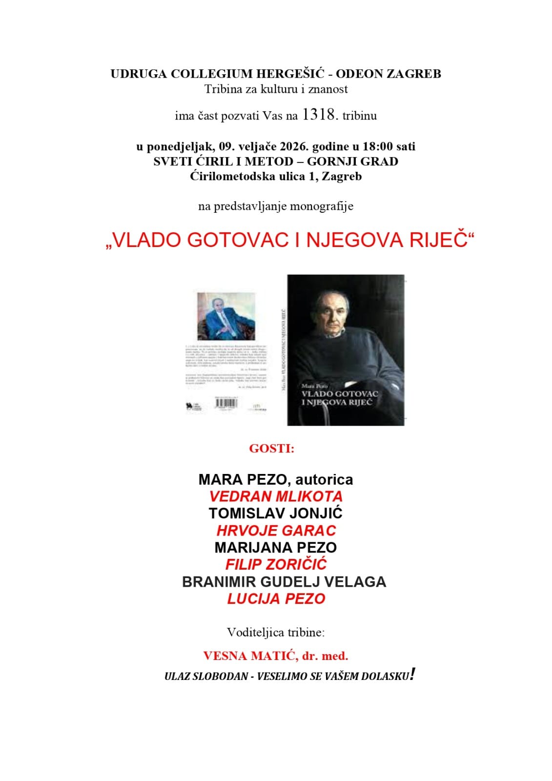 Vlado Gotovac i njegova riječ, knjiga autorice Mare Pezo, sinoć je promovirana u organizaciji Udruge Collegium Hergešić na zagrebačkom Gornjem gradu. Tako su zagrebački Imoćani, nakon imotske promocije u prosincu, imali priliku sinoć prisjetiti se velikog Vlade Gotovca koji je svoj duh i tijelo uložio u neizbrisive žrtvoslovne temelje stvaranja slobodne i demokratske Hrvatske, kako u predgovoru knjige piše Mladen Vuković. Ovom knjigom autorica profesorica Mara Pezo podsjeća na bogati pjesnički i prozni Gotovčev opus. Njegovu duhovnost, mudroslovlje, govorništvo, a nadasve ljubav prema hrvatskoj riječi i jeziku.