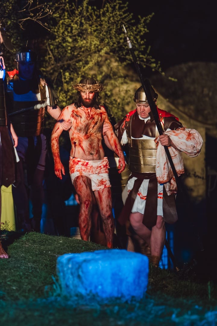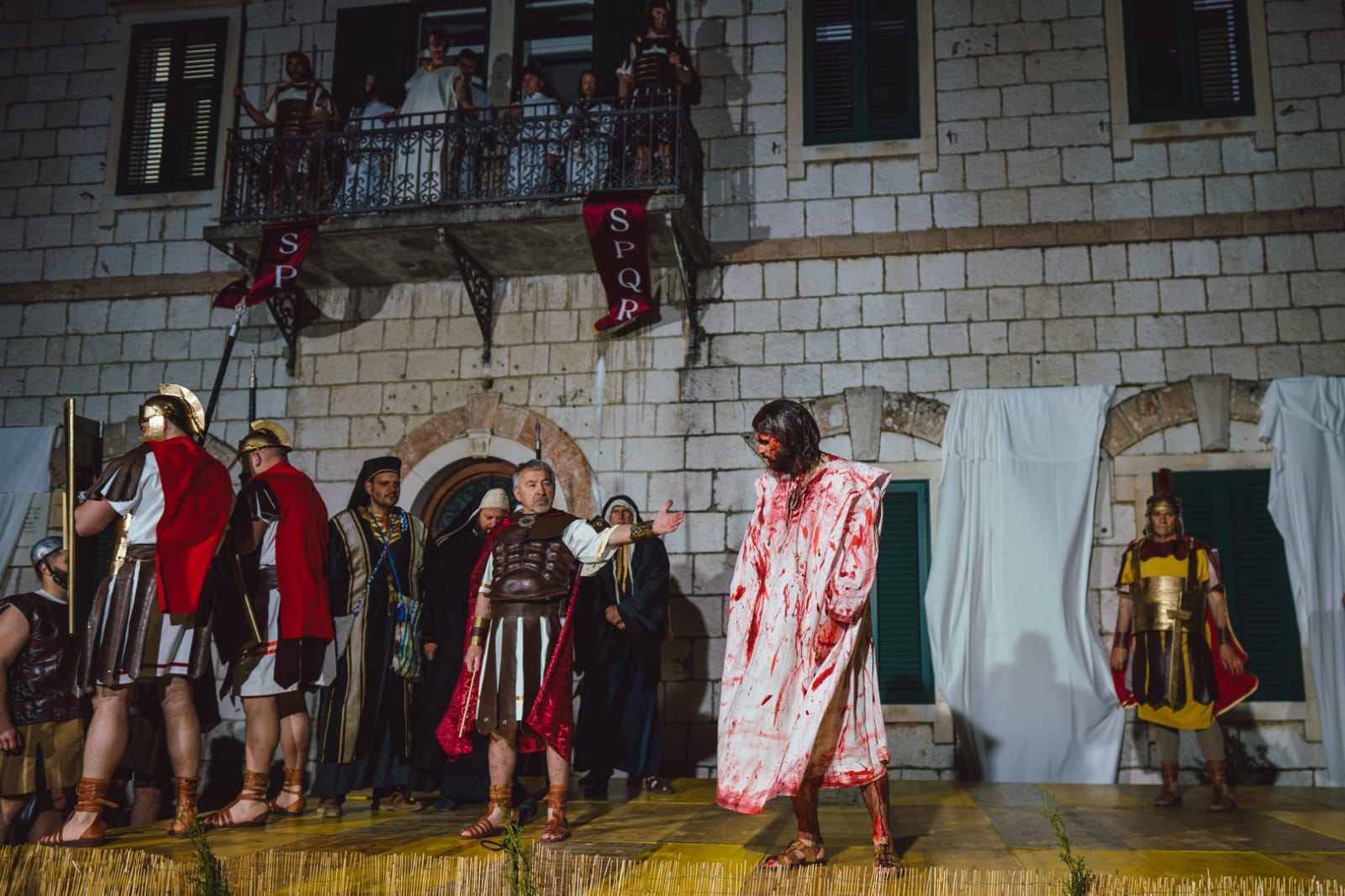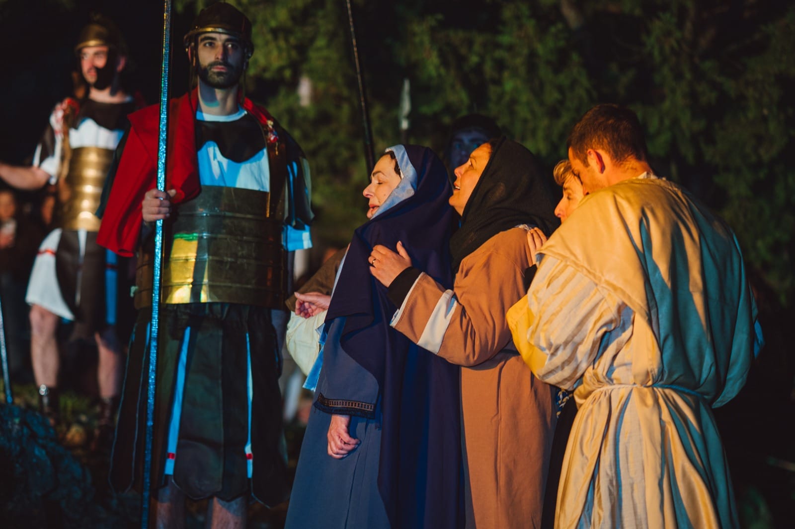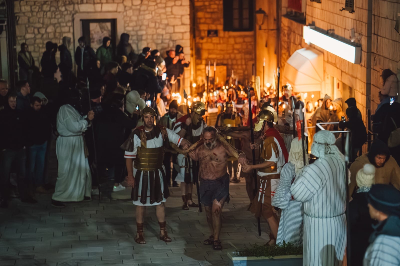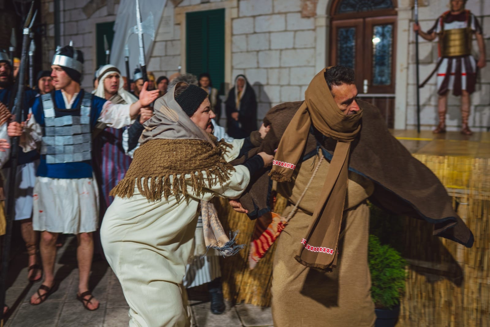 Posebno dojmljiva bila je scena raspeća, smještena pod mitskom starohrvatskom utvrdom Topanom. Upravo ta scena ostavlja neizbrisiv dojam na posjetitelje i ujedno je postala zaštitni znak ove korizmene manifestacije.