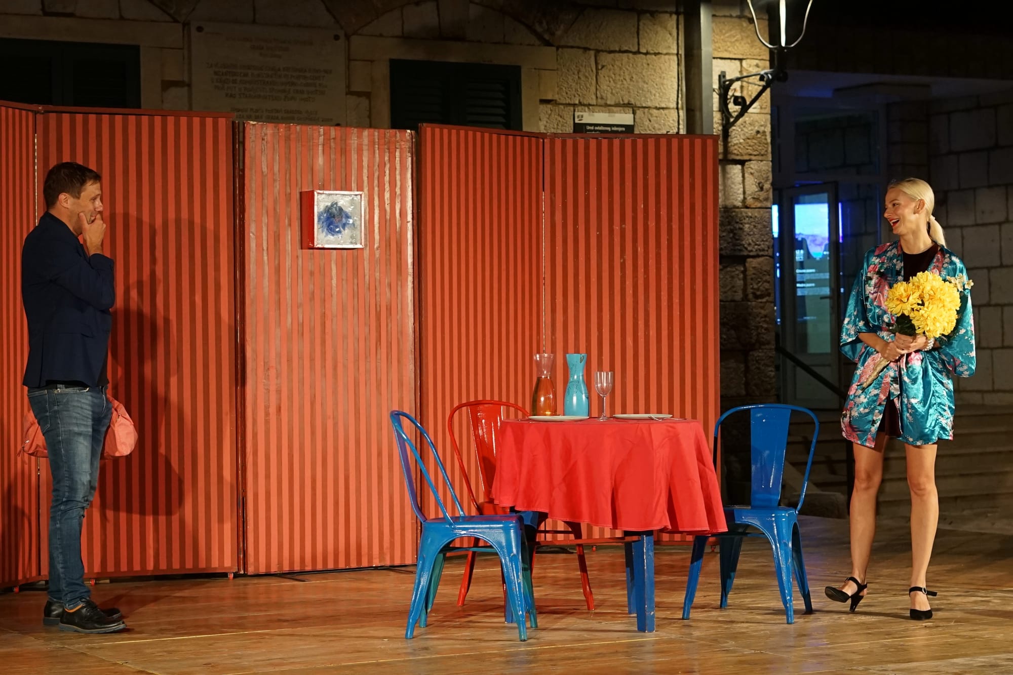 Mnogobrojna publika uživala je u predstavi “Prekid preko veze” Kazališta Moruzgva održanoj sinoć ispred zgrade poglavarstva u sklopu „Imotskih sila“. Uistinu su brzo prošla dva sata ove urnebesne komedije, te je oduševljena publika smijehom i pljeskom povremeno prekidala maestralnu izvedbu svih troje glumaca. Filip Detelić, Matija Šakoronja i Petra Kurtela, inače dobitnici prestižne Nagrade hrvatskog glumišta, ispraćeni su ovacijama, a posebna atmosfera koja se rodila iz kontakta ovih troje izvrsnih glumaca i smijeha željne publike zasigurno će ostati u lijepom sjećanju svima. Autor ove post romantične komedije je Tristan Petitgirard, u režiju potpisuje Krešimir Dolenčić.