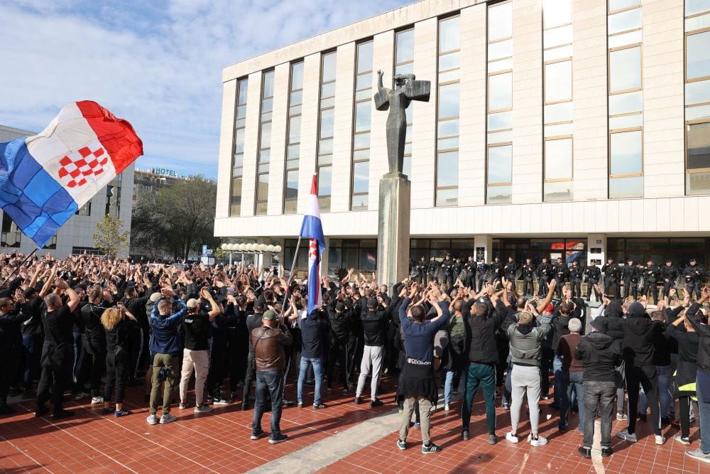 Na početku Torcidina prosvjeda, kojemu je potporu dao i dio braniteljskih udruga, intonirana je hrvatska himna “Lijepa naša”, nakon čega je uslijedila minuta šutnje za sve poginule i nestale u Domovinskom ratu.