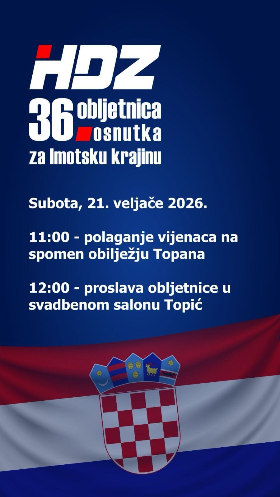 U organizaciji Hrvatske demokratske zajednice (HDZ) za Imotsku krajinu u subotu, 21. veljače, bit će obilježena 36. obljetnica osnutka te stranke, izvijestili su iz organizacijskog odbora.