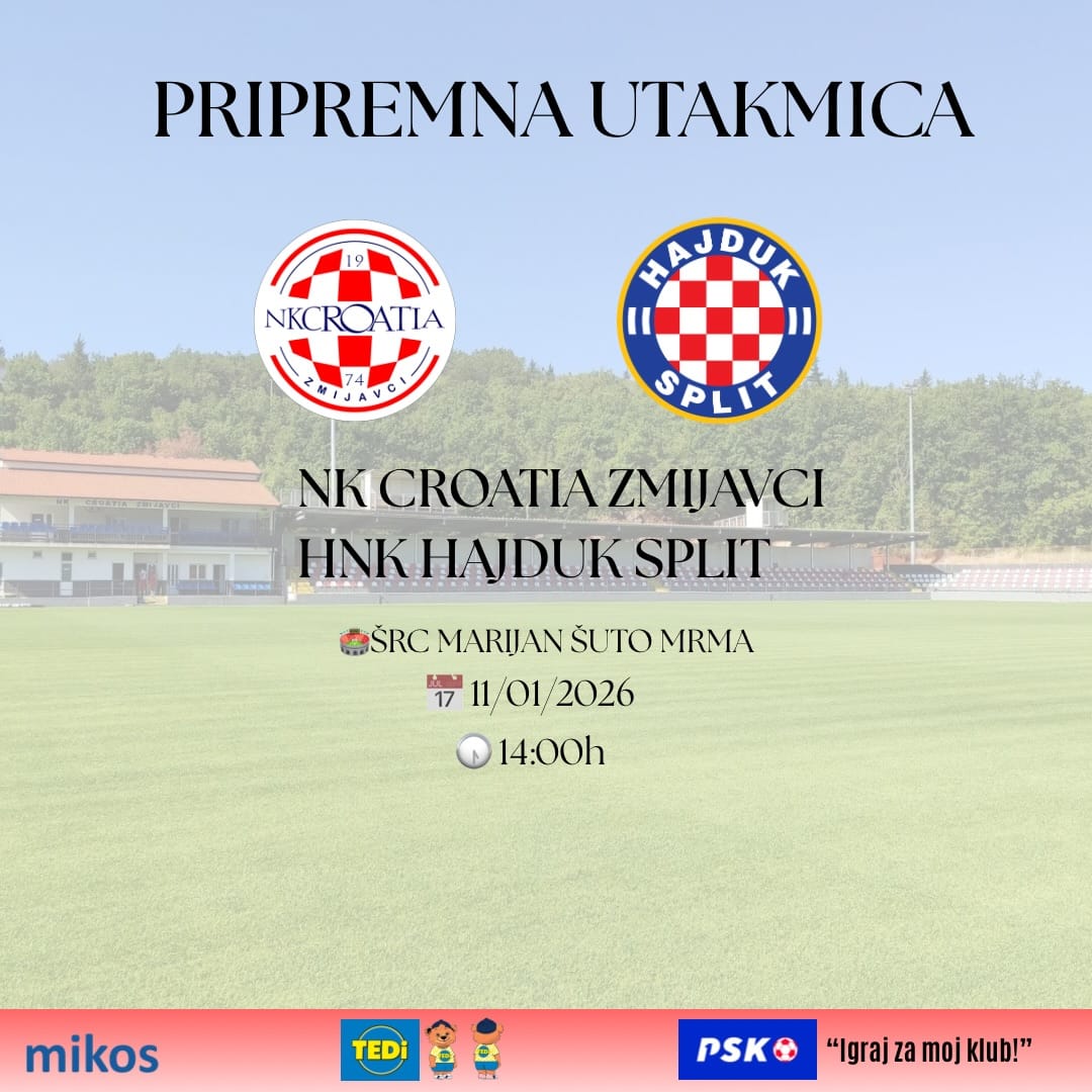 NK Croatia Zmijavci s ponosom najavljuje dolazak HNK Hajduk Split, s kojim će u sklopu zimskih priprema odigrati prijateljsku utakmicu.