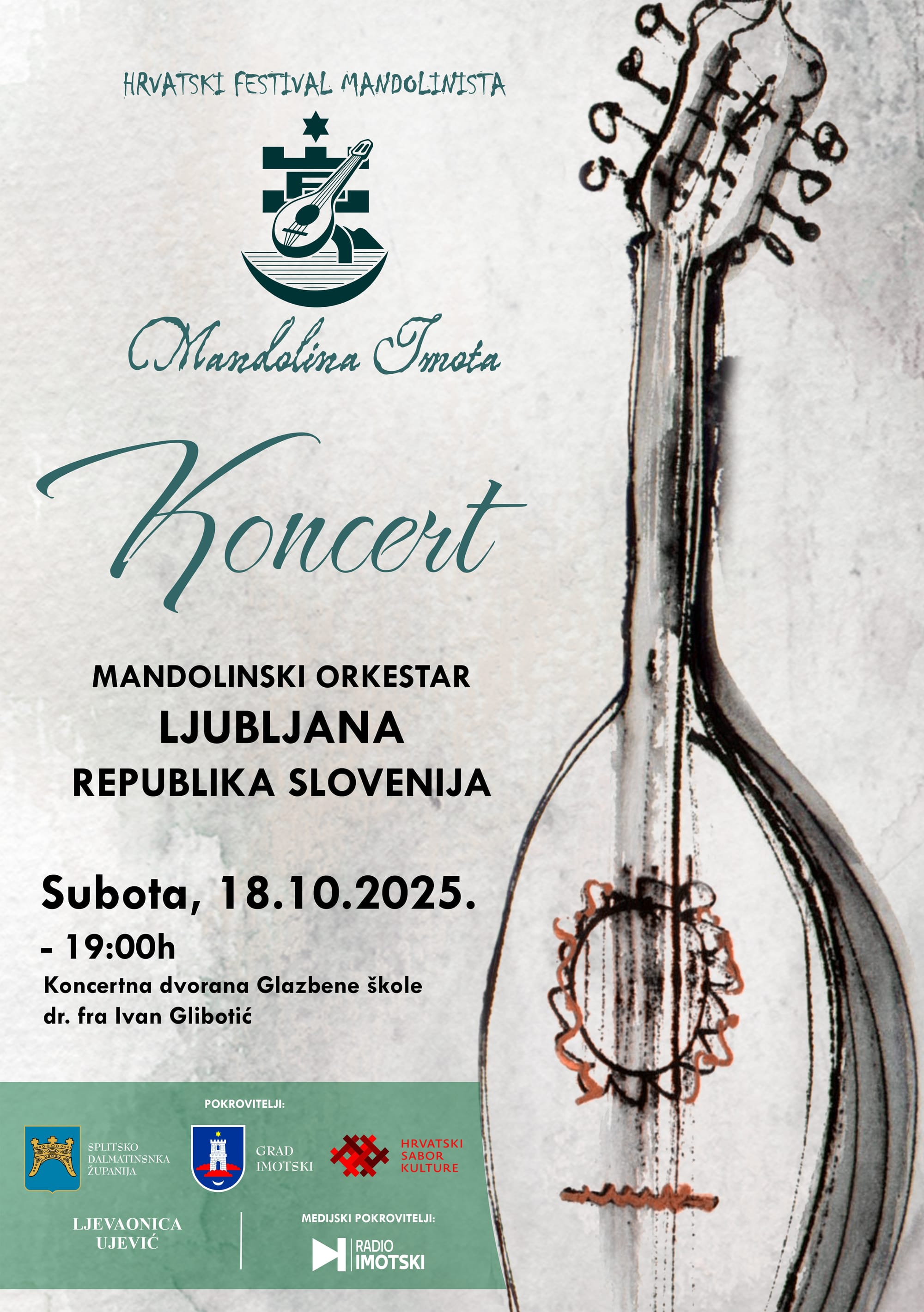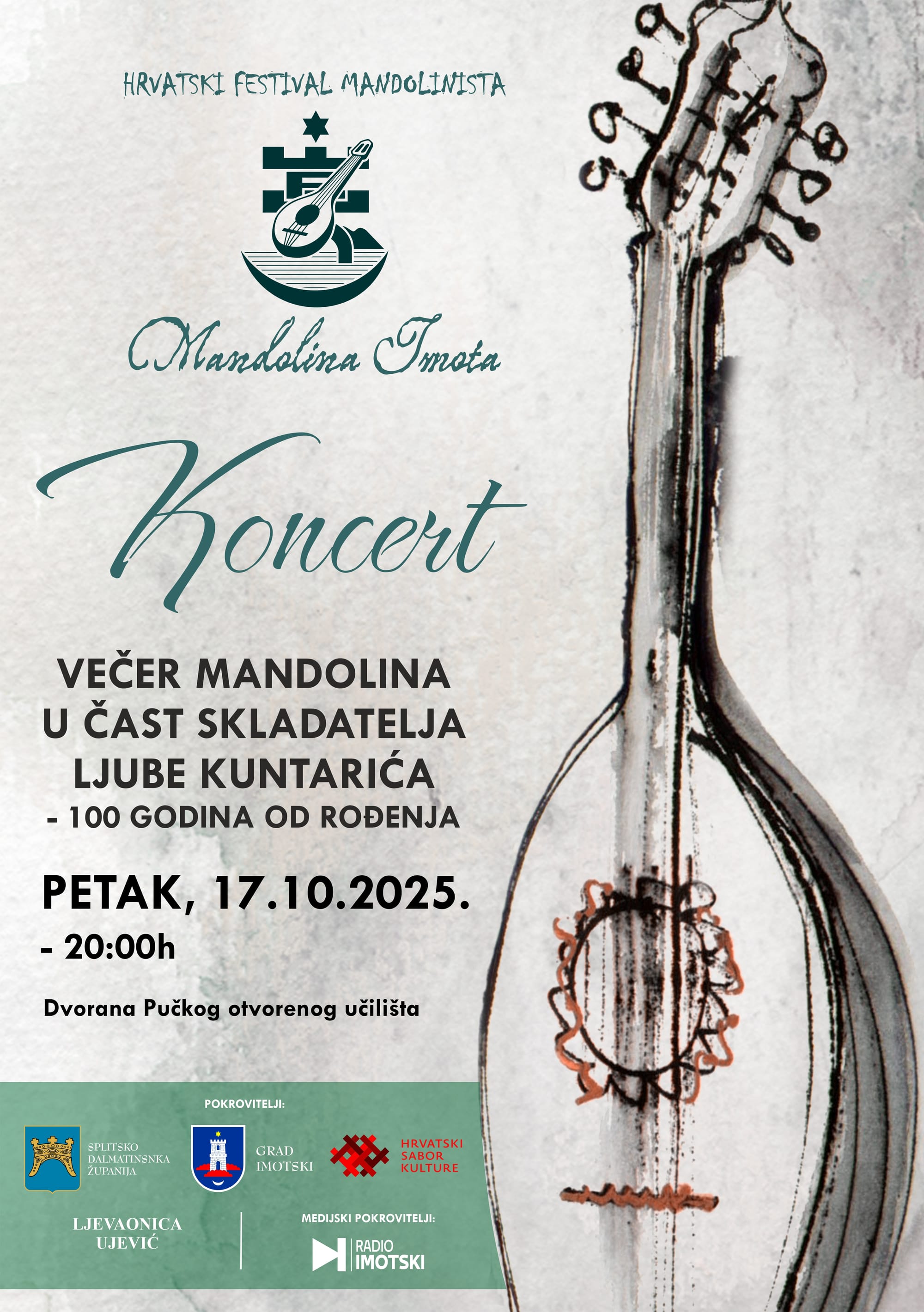 Ovog vikenda u Imotskom će se održati 29. Hrvatski festival Mandolina Imota. Svečano otvaranje festivala je u petak 17. listopada u dvorani Pučkog otvorenog učilišta Imotski od 20 sati kada započinje Večer mandolina u čast skladatelja Ljube Kuntarića – 100 godina od rođenja.