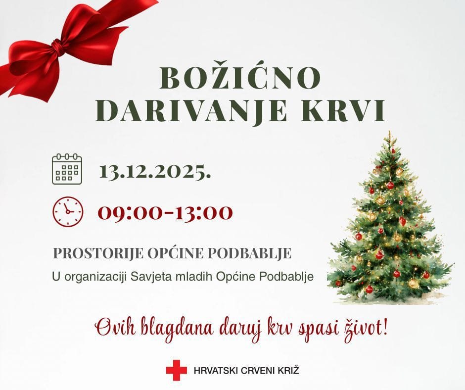 Savjet mladih Općine Podbablje u suradnji s Hrvatskim Crvenim križem organizira tradicionalno božićno darivanje krvi, koje će se održati 13. prosinca 2025. godine u prostorijama Općine Podbablje. Akcija će trajati od 9:00 do 13:00 sati.