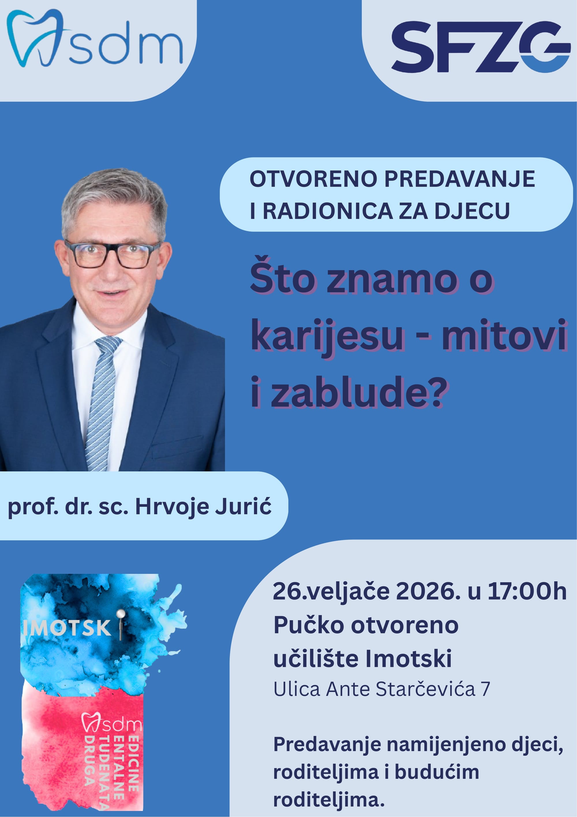 Dok će roditelji sudjelovati u edukativnom dijelu programa, za djecu će se paralelno održavati interaktivna radionica prilagođena njihovoj dobi. U sklopu manifestacije bit će postavljeni sponzorski štandovi na kojima će posjetitelji moći saznati više o proizvodima i uslugama vezanima uz oralno zdravlje. Cilj događanja je pružiti roditeljima stručne i korisne informacije o pravilnoj oralnoj higijeni djece, prevenciji i očuvanju zdravlja zubi od najranije dobi. Kao dodatni znak pažnje, sudionicima će biti dostupni i prigodni promotivni materijali.
