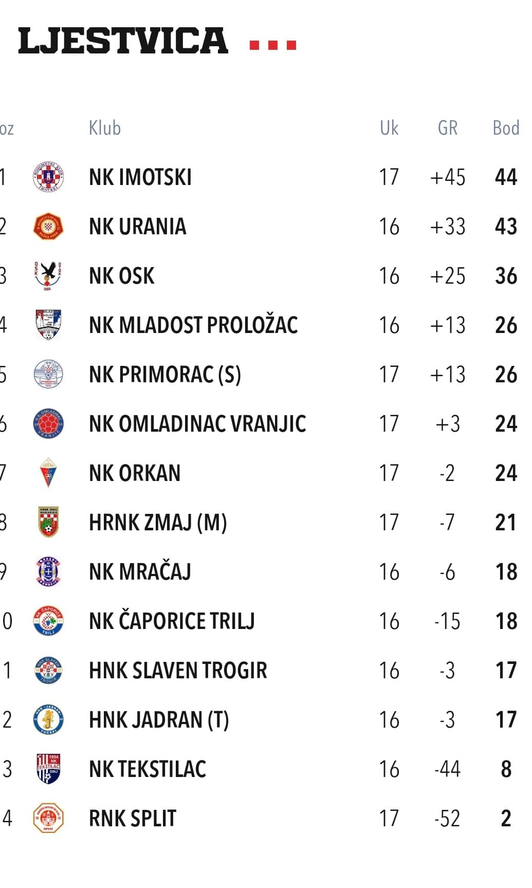Tom pobjedom Imotski je preuzeo prvo mjesto na ljestvici nakon što je dosadašnji lider Urania poražen na gostovanju kod OSK-a rezultatom 3:2.
