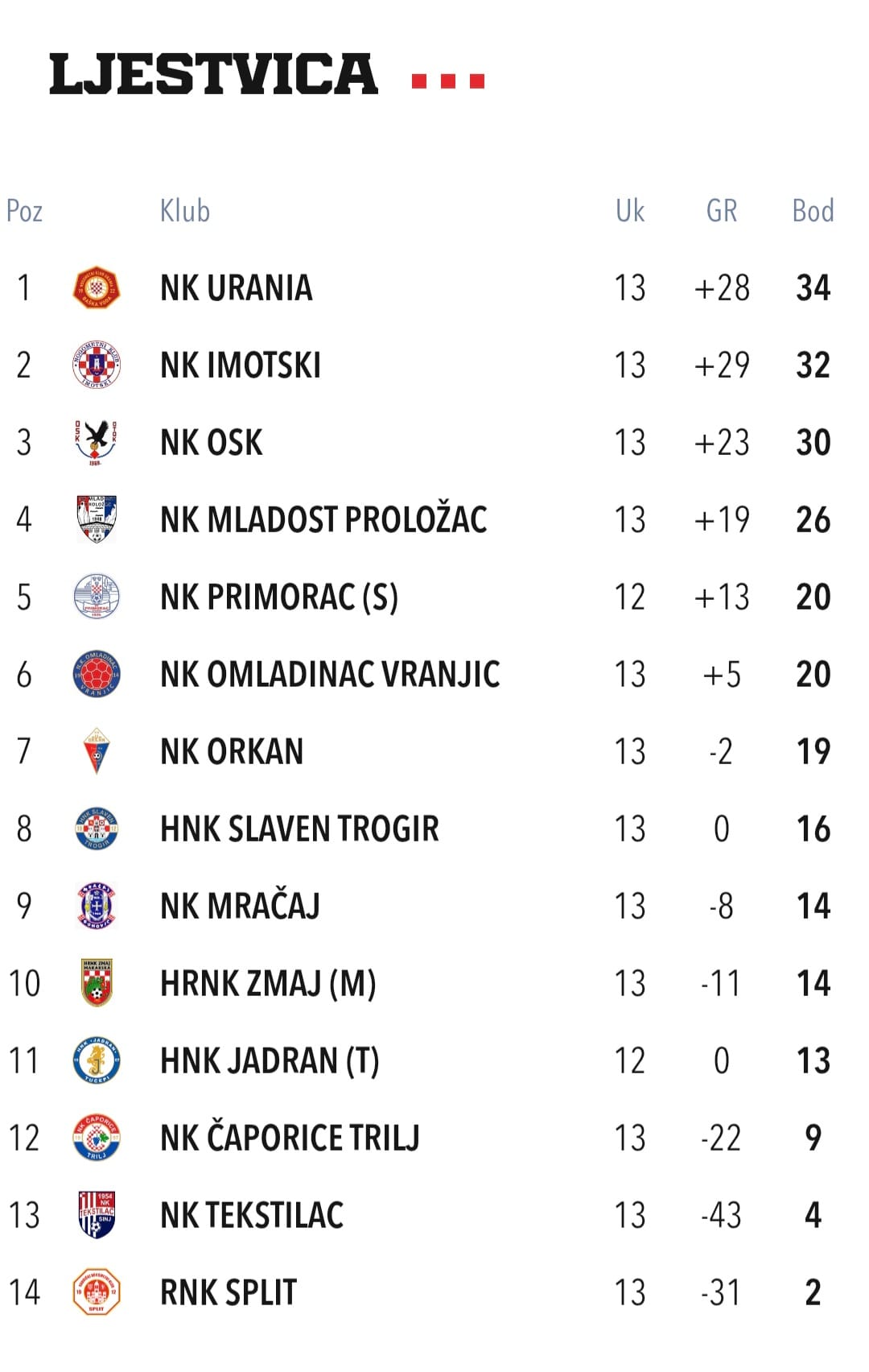 U posljednjem vikendu jesenskog dijela natjecanja u županijskim ligama na Gospinu docu gostovao je uvijek neugodni Omladinac iz Vranjica. Tradicionalno čvrsta i borbena momčad vodila je protiv Imoćana 0:2, ali su domaći igrači zasluženo preokrenuli rezultat u svoju korist rezultatom 4:2. NK Imotski opet je pokazao da ove jeseni djeluje sigurno i stabilno. Vodeća Uranija poražena je u Prološcu od Mladosti koja je golovima Tolića i D. Češljara 2 pobijedila 3:1. Imotski se zahvaljujući Proložanima primakao na samo dva boda vodećoj Uraniji. Mračaj je u Sinju pobijedio Tekstilca 0:1 te se domogao prijeko potrebnih bodova za potvrdu pozicije u sredini ljestvice.