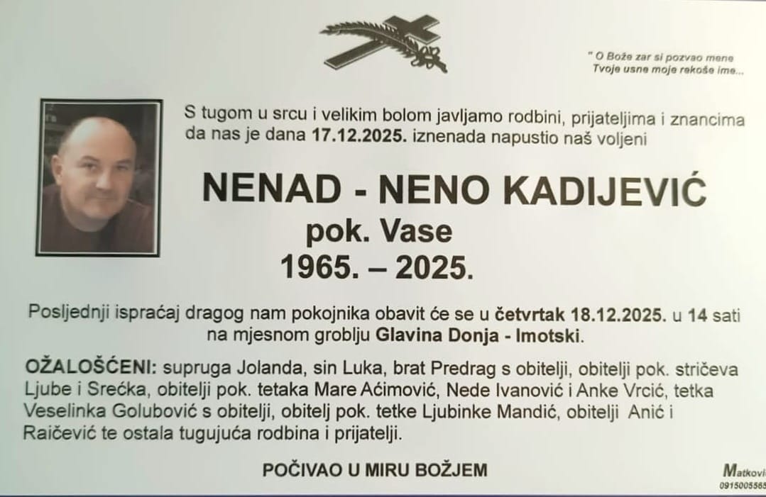 Umro je Nenad - Neno Kadijević. Predivan čovjek, tih, miran, nenametljiv, povučen, radišan, a opet gord, pametan, susretljiv, pravi prijatelj. Otišao je tako nenadno baš kakvo mu je ime. Velika šteta, velika praznina, posebno za njegovu obitelj, ali i za sve one koji su ga poznavali. Oni koji su imali tu čast da s njim dijele nogometni teren, svlačionicu, bio im je zaista više od suigrača. Pričao puno nije, ali je definitivno u nogometu uvijek ispunio i najmanju trenerovu želju. Uostalom, Neno Kadijević je bio jedan od najtalentiranijih vratara u Imotskoj krajini i šire. Samo splet okolnosti odmaknuo ga je od toga da postane uistinu vrhunski nogometni profesionalac. Svojevremeno, dok je još Malonogometni klub Imotski harao malim terenima u nekadašnjoj državi i kada je bio među četiri najbolje malonogometne momčadi tada je možda i najveću zaslugu za to imao upravi Neno Kadijević. Talent koji se rađa jednom u pedeset godina, a kada se k tome pridoda i njegova ljudska vrijednost, onda je Imotski stvarno izgubio velikog čovjeka. Kaže se da o mrtvima treba govoriti sve najbolje, ali o Neni i više od toga. Sad kada je tuga obuzela sve u ovom tmurnom jutru, ove tmurne srijede 17. prosinca 2025. njegovu obitelj, rodbinu, prijatelje, njegove kolege na radnom mjestu, ali i sve dobronamjernike koji su ga poznavali može se za kraj ovih tužnih rečenica kazati samo jedno: Dragi Neno i nama koji smo te poznavali, igrali s tobom, radili, konačno i pričali, opet i ponovno o nogometu, nedostajat ćeš. Silno ćeš falit. Konačno, oprosti nam, tvojim prijateljima i poznanicima što nismo više vremena provodili s tobom, jer biti s tobom značilo je biti miran, opušten, biti ono što je današnjem čovjeku najpotrebnije. Falit ćeš prijatelju, falit ćeš dobri duše imotskog nogometa. Pogreb našega Nene Kadijevića održat ćd se sutra u četvrtak 18. prosinca u 14 sati na groblju u Glavini Donjoj.