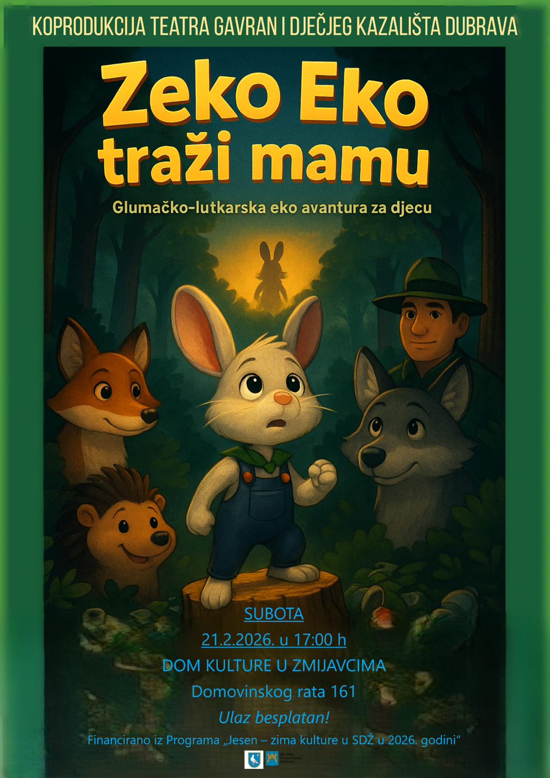 Sutra, u subotu 21. veljače 2026. godine s početkom u 17 sati, u Domu kulture Zmijavci održat će se dječja kazališna predstava “Eko zeko traži mamu”, u izvedbi Teatar Gavran i Kazalište Dubrava.