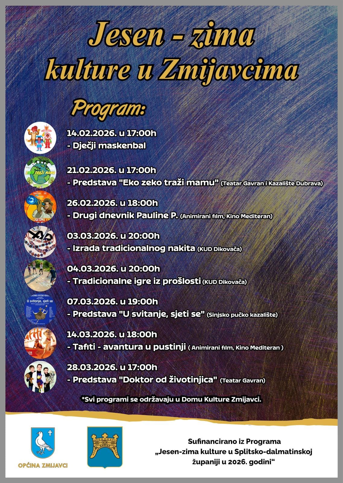 Organizatori pozivaju roditelje i djecu da dođu na vrijeme i uživaju u kazališnom doživljaju koji je već oduševio mališane diljem Hrvatske. Ulaz je slobodan, a svi programi u sklopu manifestacije održavaju se u Domu kulture Zmijavci.