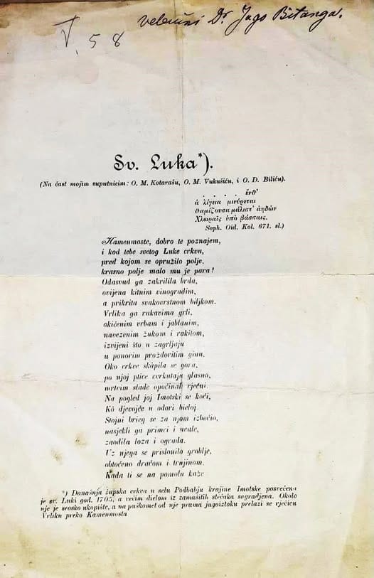 Prof. Don Josip Vergilije Perić (1845.-1919), hrvatski političar, književnik i prevoditelj spjevao je pjesmu Sv. Luka 1903. godine, a jedan tiskani primjerak poslao je dr Augustinu Bitangi, cit. Veleučni Dr. Jago Bitanga.Sv. Luka *).(Na čast mojim suputnicim: O.M. Kotarašu, O.M. Vukušiću, i O.D.Biliću).