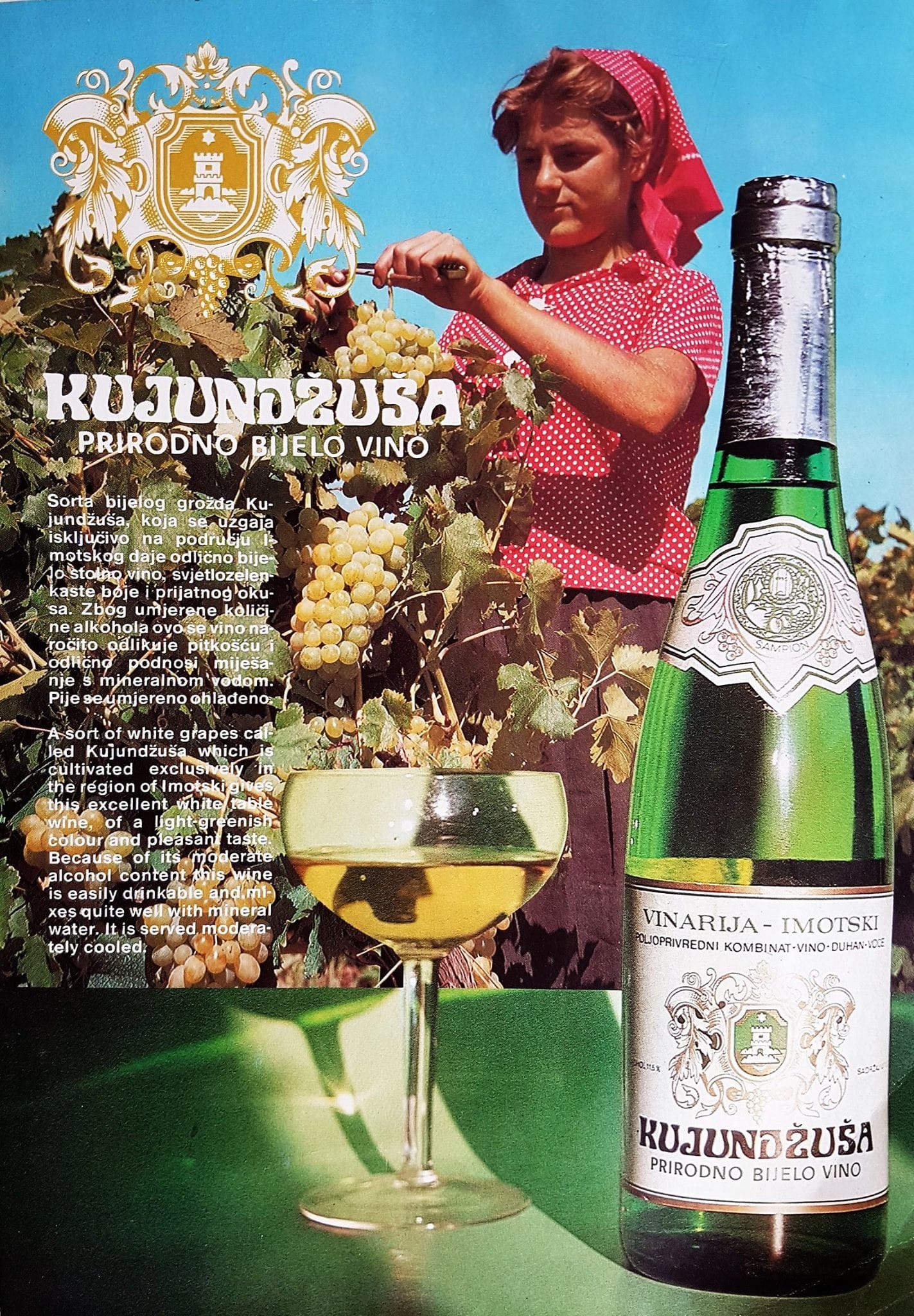 "Sorta bijelog grožđa Kujundžuša koja se uzgaja isključivo na području Imotskog daje odlično bijelo stolno vino, svjetlozelenkaste boje i prijatnog okusa. Zbog umjerene količine alkohola ovo se vino naročito odlikuje pitkošću i odlično podnosi miješanje s mineralnom vodom. Pije se umjereno ohlađeno".