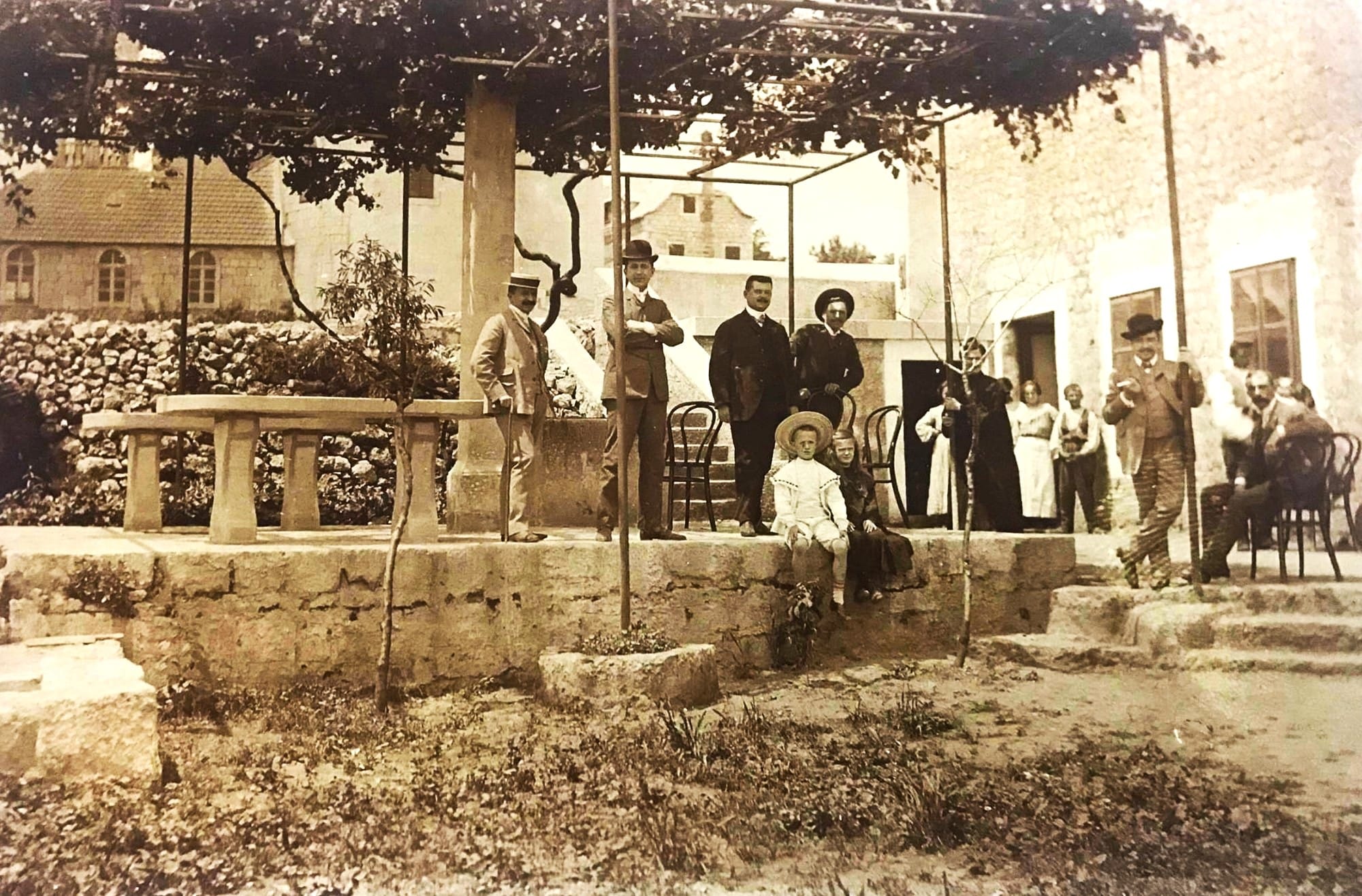 Pod pergolom u dvorištu prvog imotskog hotela “Dunda” 1905. godine. Vlasnik hotela Marko Dunda, bogati trgovac, veleposjednik, prvi imotski hotelijer i jedan od prvih nakladnika razglednica sa imotskim motivima (1870.-1928.) rođen je i umro u Imotskom. Oženio se za Anu Matejević (1871.) s kojom je imao dvoje djece, Franu Mihu (1893.) i Ljeposavu (1898-1980.) udanu za dr Janka Raku (1897.-1937.). Ljeposava Lipa i dr Janko Rako imali su tri sina: Nebojšu, Živana Cicka i Aljošu. U dvorištu obiteljskog hotela Marko Dunda sjedi krajnje desno, a na zidiću sjede njegova djeca, sin Frane Miho i kćer Ljeposava. U pozadini s lijeve strane fotografije vidi se stražnji dio crkve sv. Frane, a desno se vidi dio kuće Colombani.