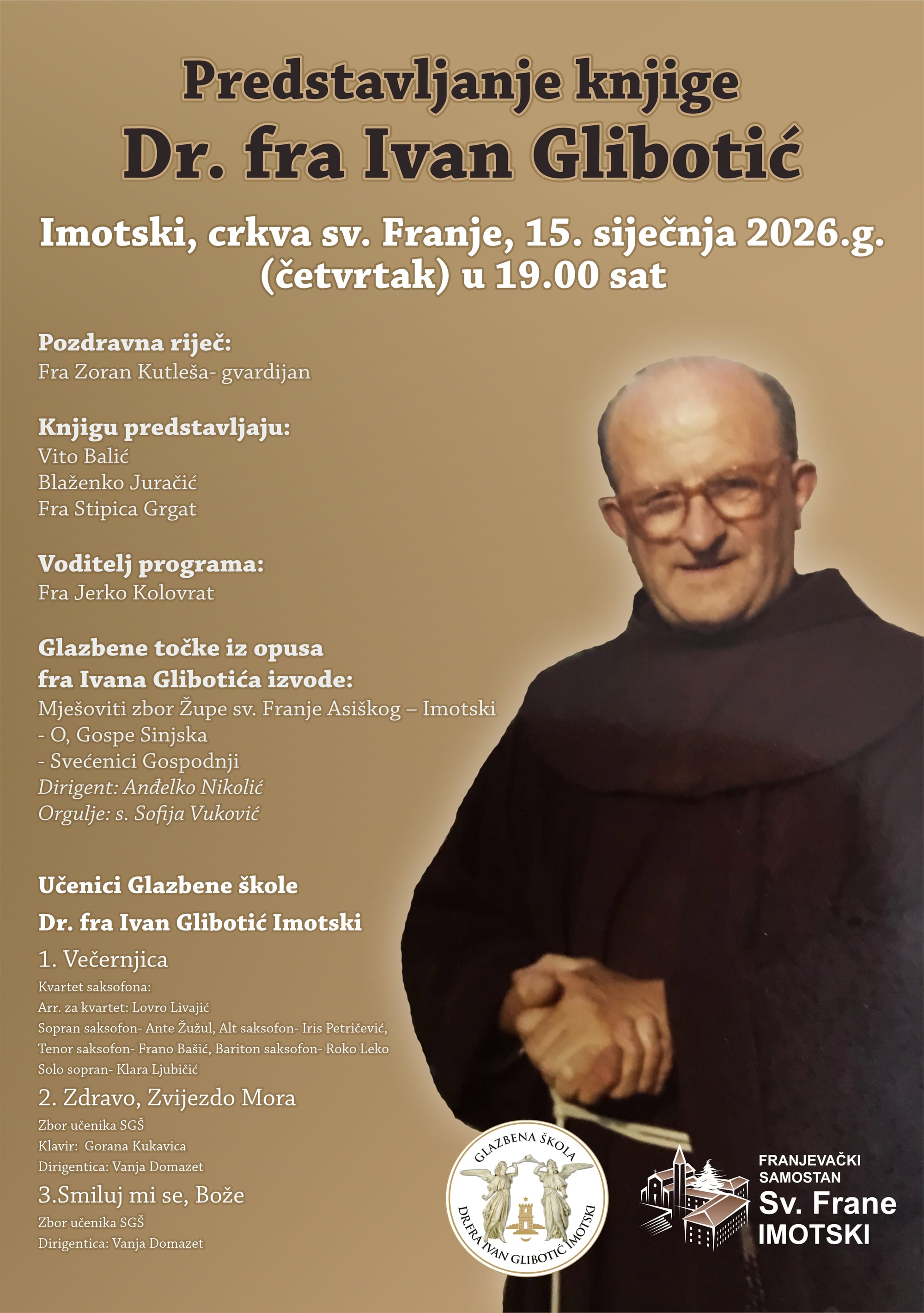 U glazbenom dijelu večeri nastupit će Mješoviti zbor Župe sv. Franje Asiškog – Imotski, koji će izvesti skladbe iz opusa fra Ivana Glibotića: „O, Gospe Sinjska“ i „Svećenici Gospodnji“, pod ravnanjem dirigenta Anđelka Nikolića, uz orguljsku pratnju s. Sofije Vuković.
