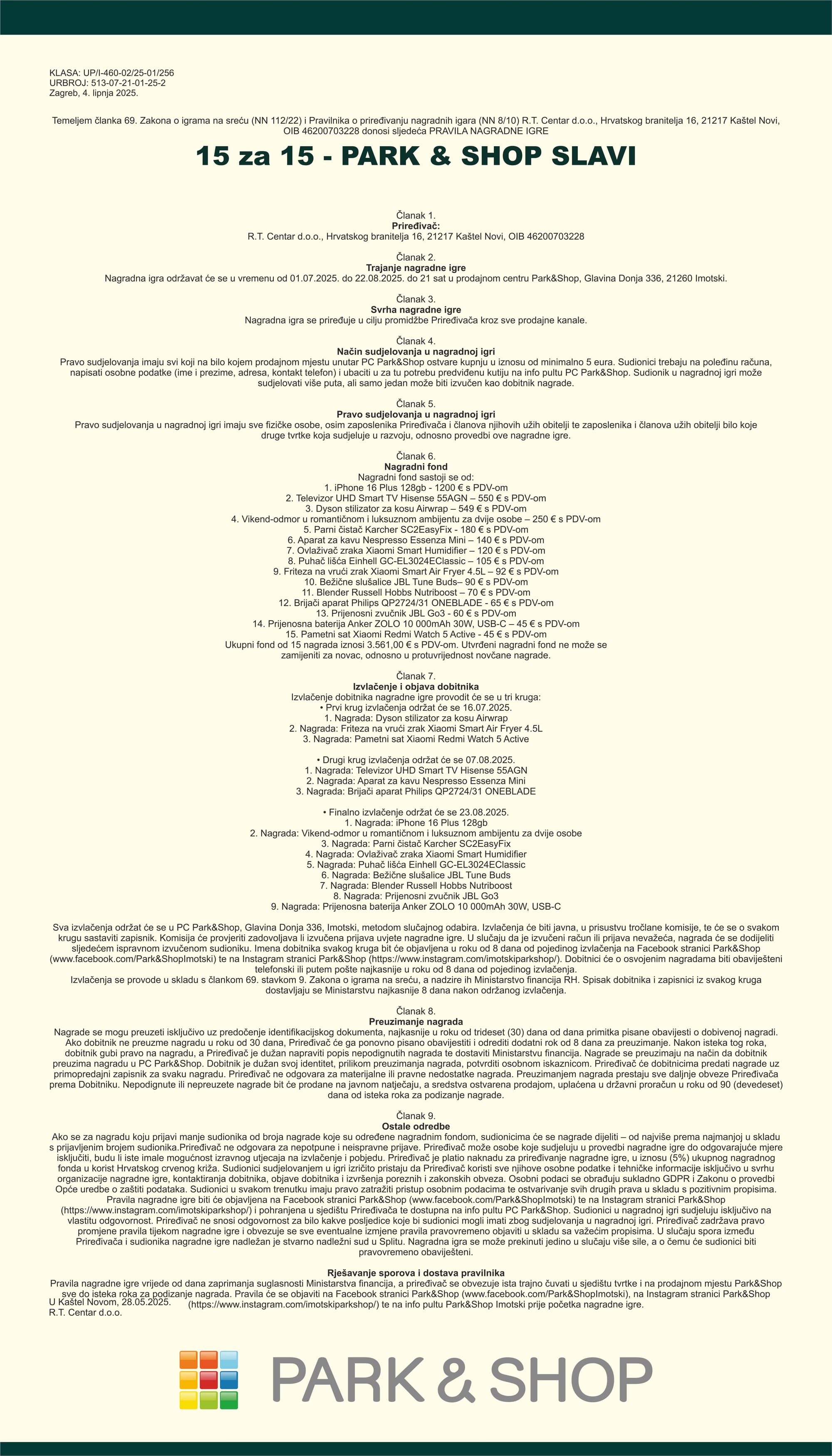 Od 1.7. do 22.8. u Park&Shopu Imotski traje nagradna igra 𝟭𝟱 𝘇𝗮 𝟭𝟱 - 𝗣𝗮𝗿𝗸&𝗦𝗵𝗼𝗽 𝘀𝗹𝗮𝘃𝗶! U nastavku donosimo službeni pravilnik: