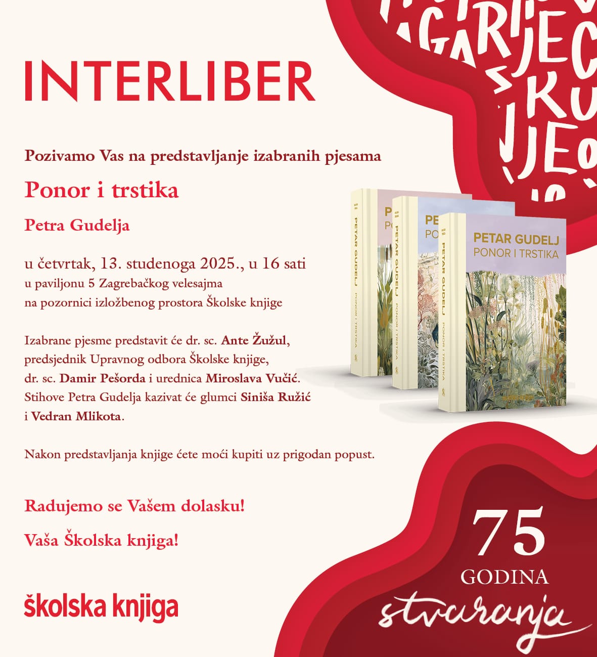 U četvrtak, 13. studenoga u 16:00 sati u sklopu Interlibera, u paviljonu 5 Zagrebačkog velesajma bit će predstavljeno troknjižje PONOR I TRSTIKA, izabrane pjesme u tri knjige koje je za života priredio autor Petar Gudelj, koji je preminuo u veljači ove godine. Izabrane pjesme predstavit će dr. sc. Ante Žužul, predsjednik Upravnog odbora Školske knjige, urednica Miroslava Vučić i Sanda Lončar Ružić. Stihove Petra Gudelja kazivat će glumci Siniša Ružić i Vedran Mlikota. Nakon predstavljanja knjige će se moći kupiti uz prigodan popust.