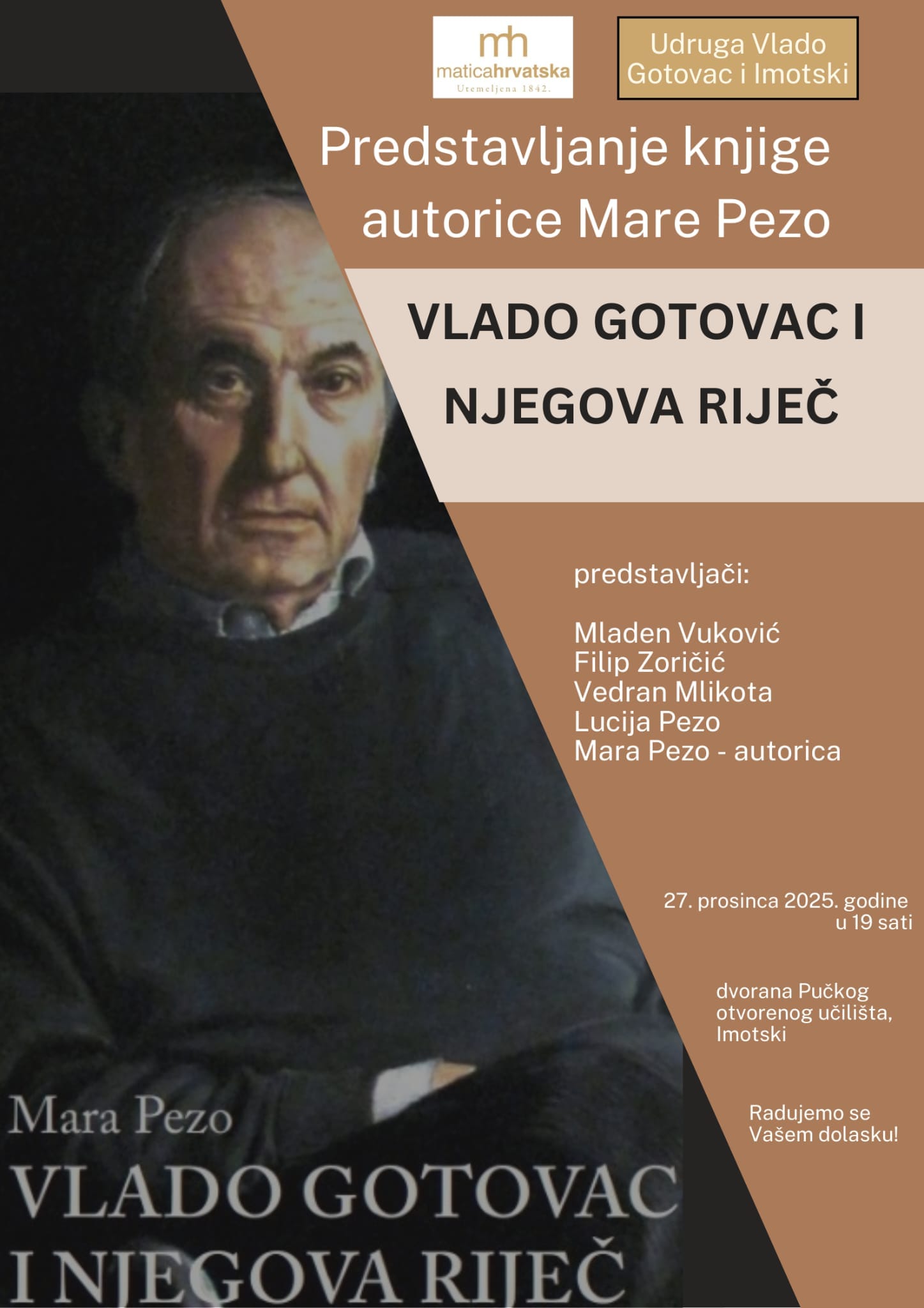 Imotski ogranak Matice hrvatske i „Udruga Vlado Gotovac i Imotski“ pozivaju Vas na predstavljanje knjige autorice Mare Pezo pod naslovom Vlado Gotovac i njegova riječ.