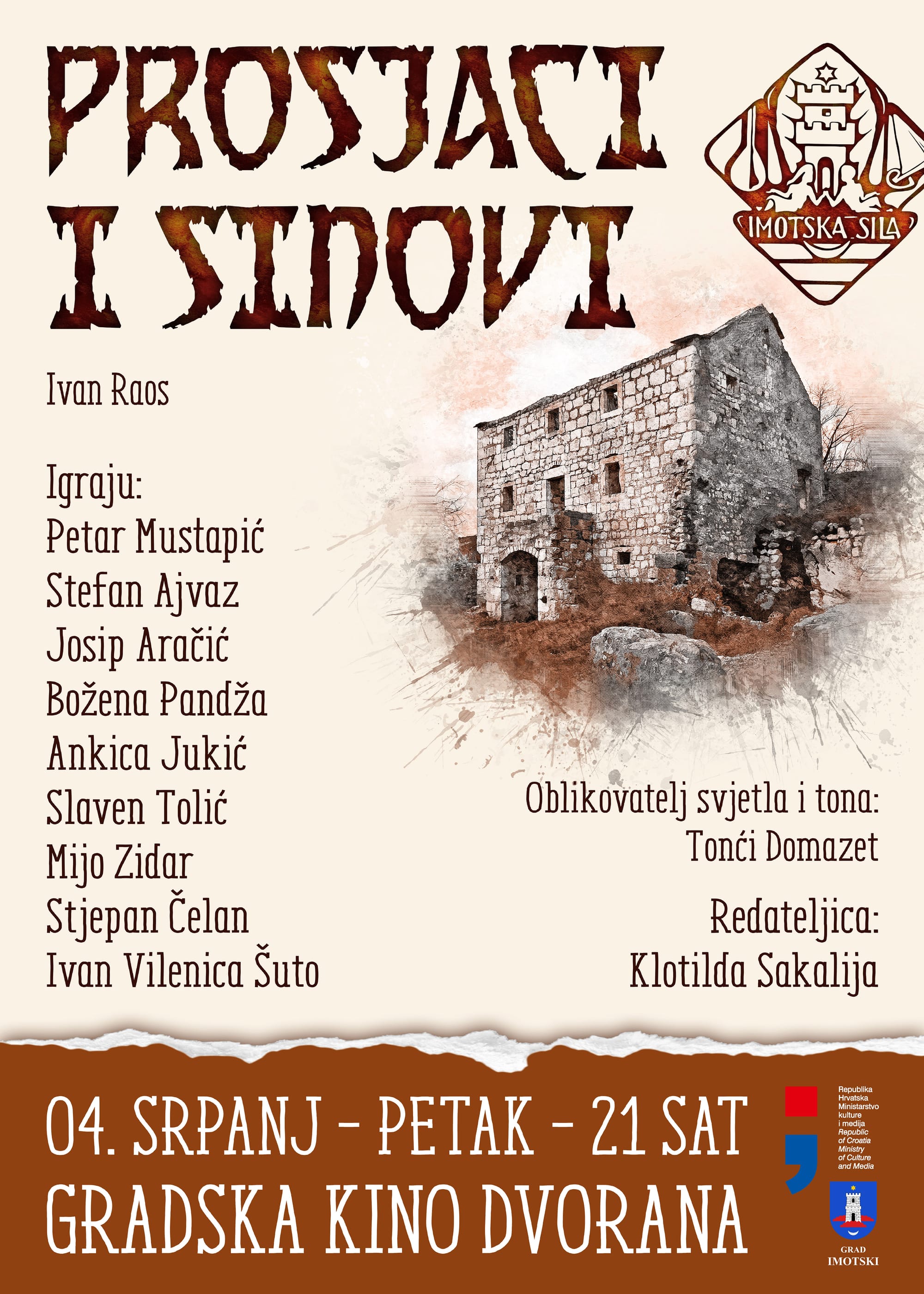 U petak 04. srpnja u gradskoj kino dvorani predstavom „Prosjaci i sinovi“ otvaraju se 49. „Imotska sila“. Predstava je napravljena po tekstu Ivana Raosa u adaptaciji i režiji prof. Klotilde Sakalije, a izvesti će je glumci amateri koji djeluju pri Pučkom otvorenom učilištu Imotski. Igraju Petar Mustapić, Stefan Ajvaz, Josip Aračić, Božena Pandža, Ankica Jukić, Slaven Tolić, Mijo Zidar, Stjepan Čelan i Ivan Vilenica Šuto. Oblikovatelj svjetla i tona – Tonći Domazet.