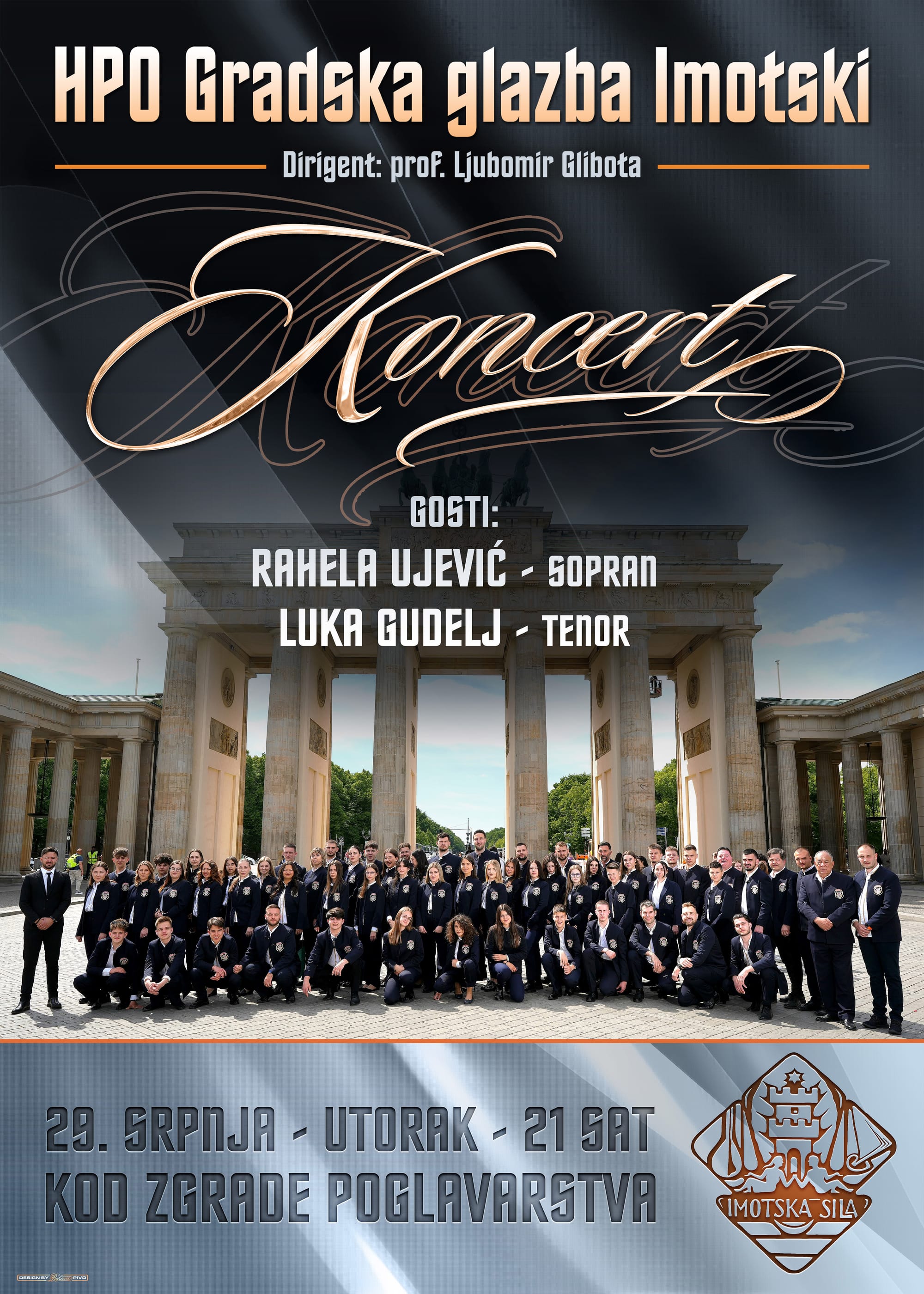 U utorak 29. srpnja ispred zgrade poglavarstva s početkom u 21 sat već tradicionalno će se održati koncert HPO Gradske glazbe Imotski vođen dirigentskom palicom prof. Ljubomira Glibote. Prošlogodišnji europski prvaci ovaj put će nas zabaviti muziciranjem uz pomoć svojih gostiju, sopranistice Rahele Ujević i tenora Luke Gudelja. U slučaju nevremena, koncert će biti održan u koncertnoj dvorani glazbene škole "Dr. fra Ivan Glibotić".
