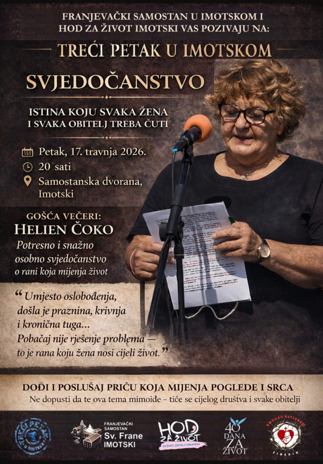 U organizaciji Franjevačkog samostana u Imotskom i inicijative Hod za život, u petak, 17. travnja, održat će se večer svjedočanstva u sklopu programa "Treći petak u Imotskom".