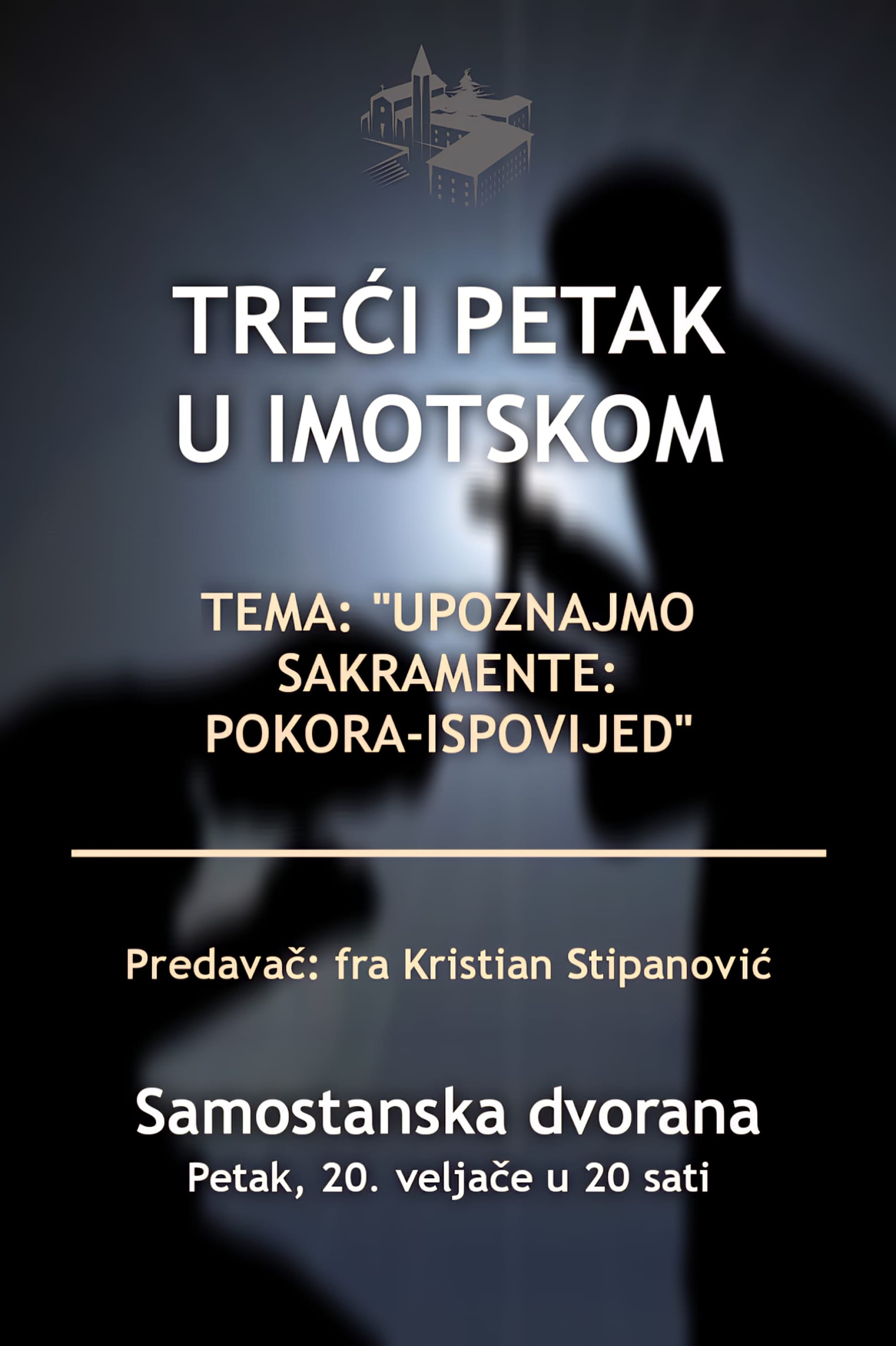 U petak, 20. veljače, u Imotskom će se održati tribina pod nazivom „Treći petak u Imotskom“, namijenjena svima koji žele produbiti svoje duhovno znanje i razumijevanje vjere. Tribina će se održati u samostanskoj dvorani s početkom u 20 sati, a tema susreta je „Upoznajmo sakramente: Pokora – ispovijed. Predavanje će održati fra Kristian Stipanović, koji će okupljenima približiti značenje i važnost sakramenta pokore u svakodnevnom životu vjernika, uz mogućnost promišljanja i osobnog duhovnog rasta. Organizatori pozivaju sve zainteresirane građane da se odazovu tribini i sudjeluju u otvorenom i poticajnom susretu koji se već tradicionalno održava svakog trećeg petka u mjesecu.