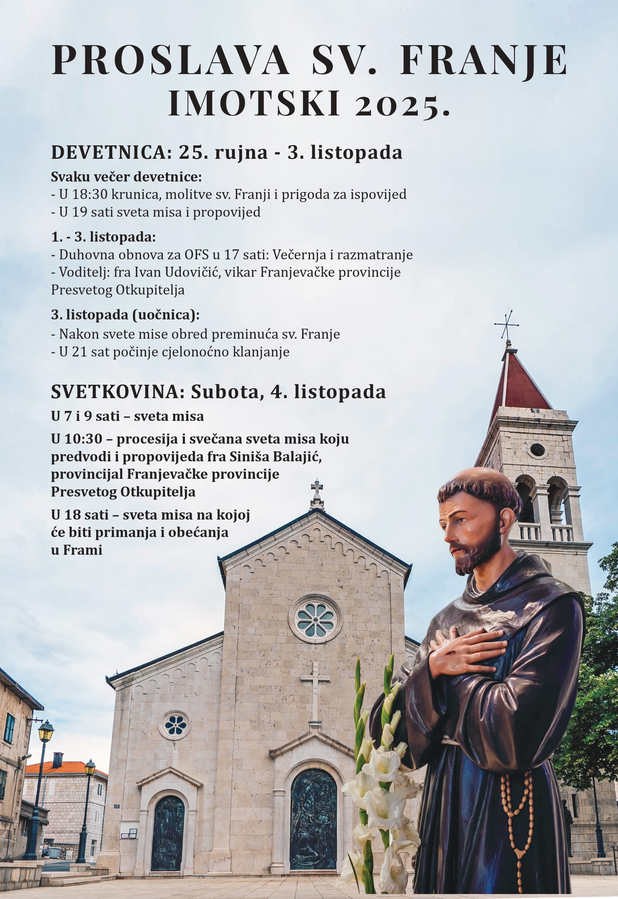 Na blagdan sv. Franje u subotu 4. listopada mise su u 7 i 9 sati, procesija sa svečanom misom je u 10.30 koju će predvoditi i propovijedati fra Siniša Balajić, provincijal Franjevačke provincije Presvetog Otkupitelja. U 18 sati će također biti sveta misa na kojoj će biti primanja i obećanja u Frami.