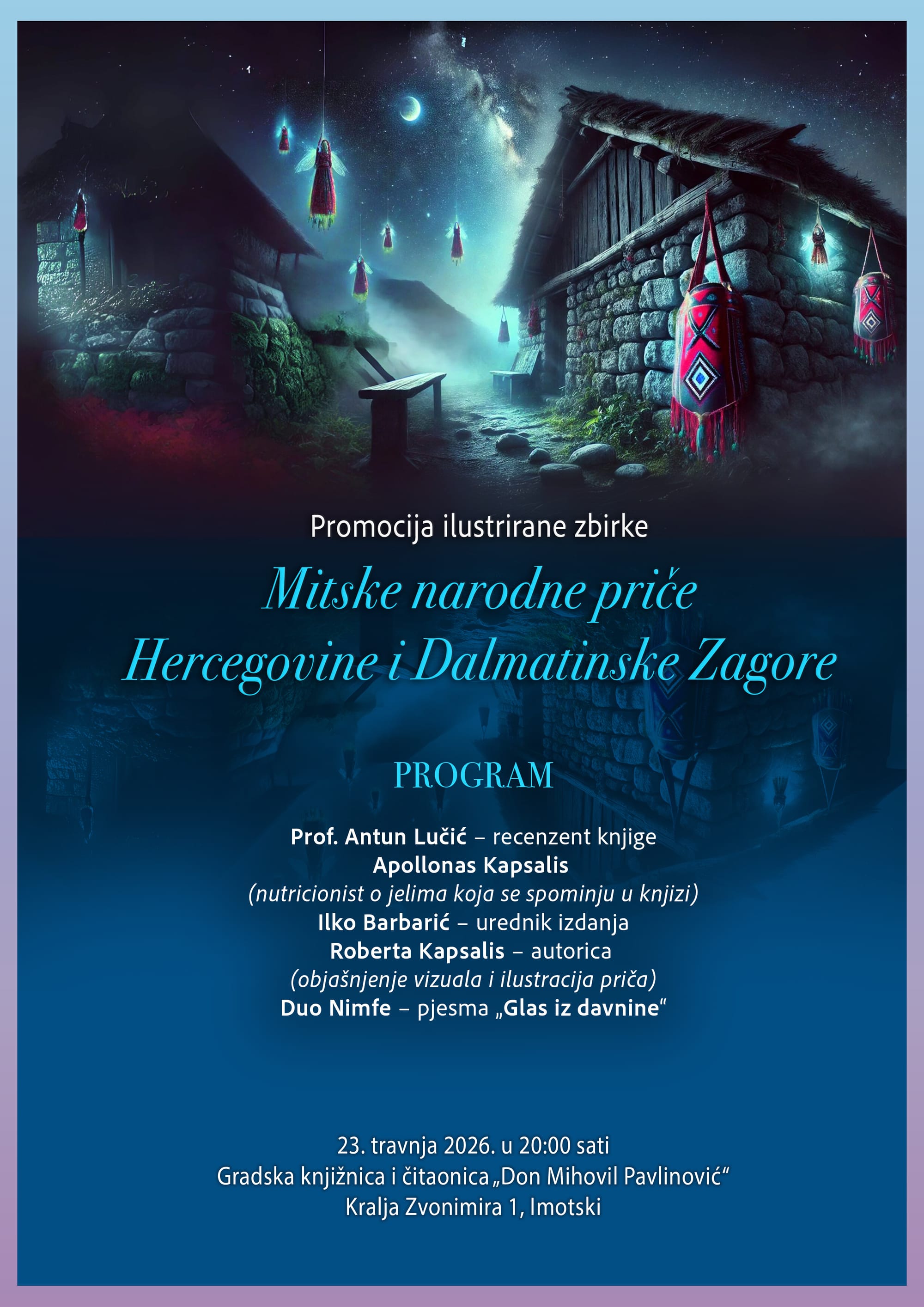 U Gradskoj knjižnici i čitaonici „Don Mihovil Pavlinović“ u Imotskom u četvrtak, 23. travnja, s početkom u 20 sati bit će predstavljena ilustrirana zbirka „Mitske narodne priče Hercegovine i Dalmatinske zagore“ autorice Roberte Kapsalis.