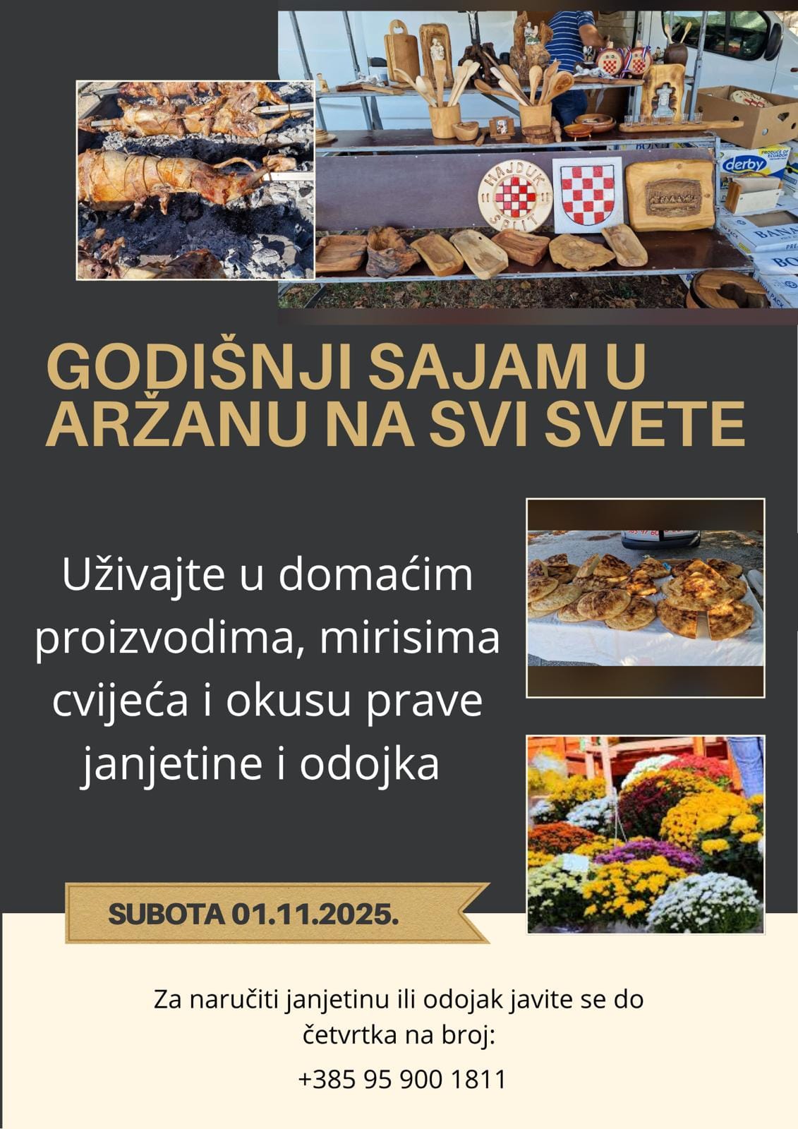 U subotu 01. studenog održava se Godišnji sajam u Aržanu na Svi svete. Posjetite Aržano i uživajte u domaćim proizvodima, mirisima cvijeća i okusu prave janjetine i odojka.