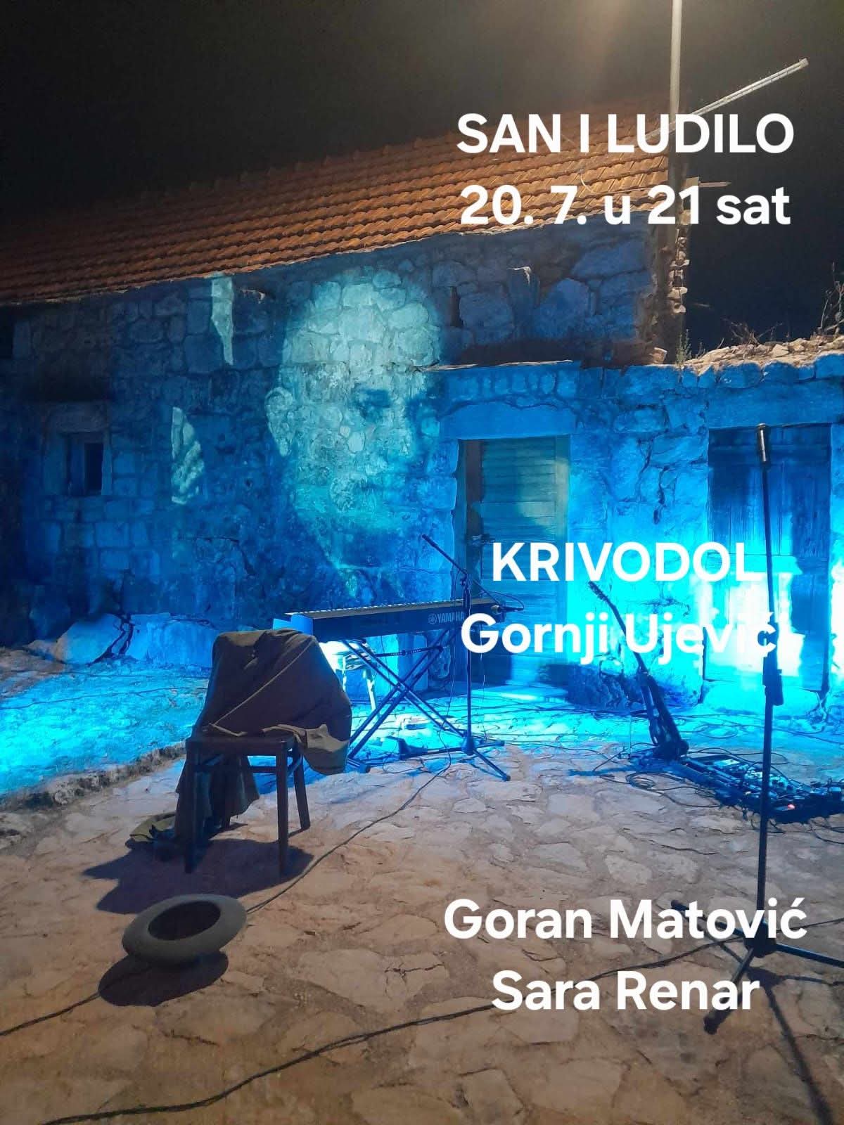 U nedjelju 20. srpnja u Krivodolu (Gornji Ujevići) predstavu San i ludilo, izvest će Sara Renar i Goran Matović. Organizator je Kulturno-umjetnička "Ujević" iz Krivodola.