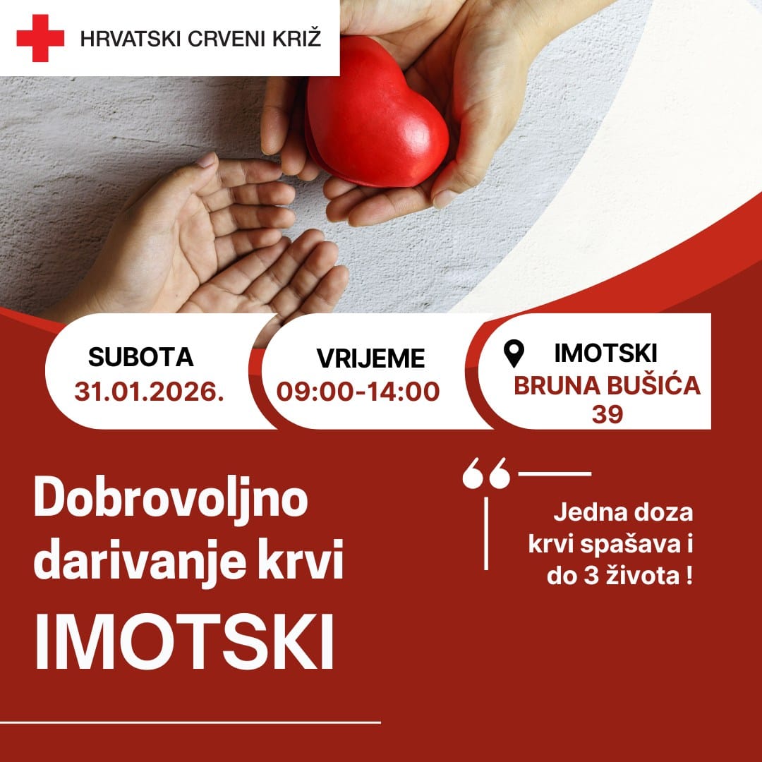 U subotu, 31. siječnja 2026. godine, u Imotskom će se održati redovna akcija dobrovoljnog darivanja krvi u organizaciji Gradskog društva Crvenog križa Imotski. Akcija će se provoditi u prostoru društva na adresi Bruna Bušića 39, u vremenu od 9 do 14 sati.