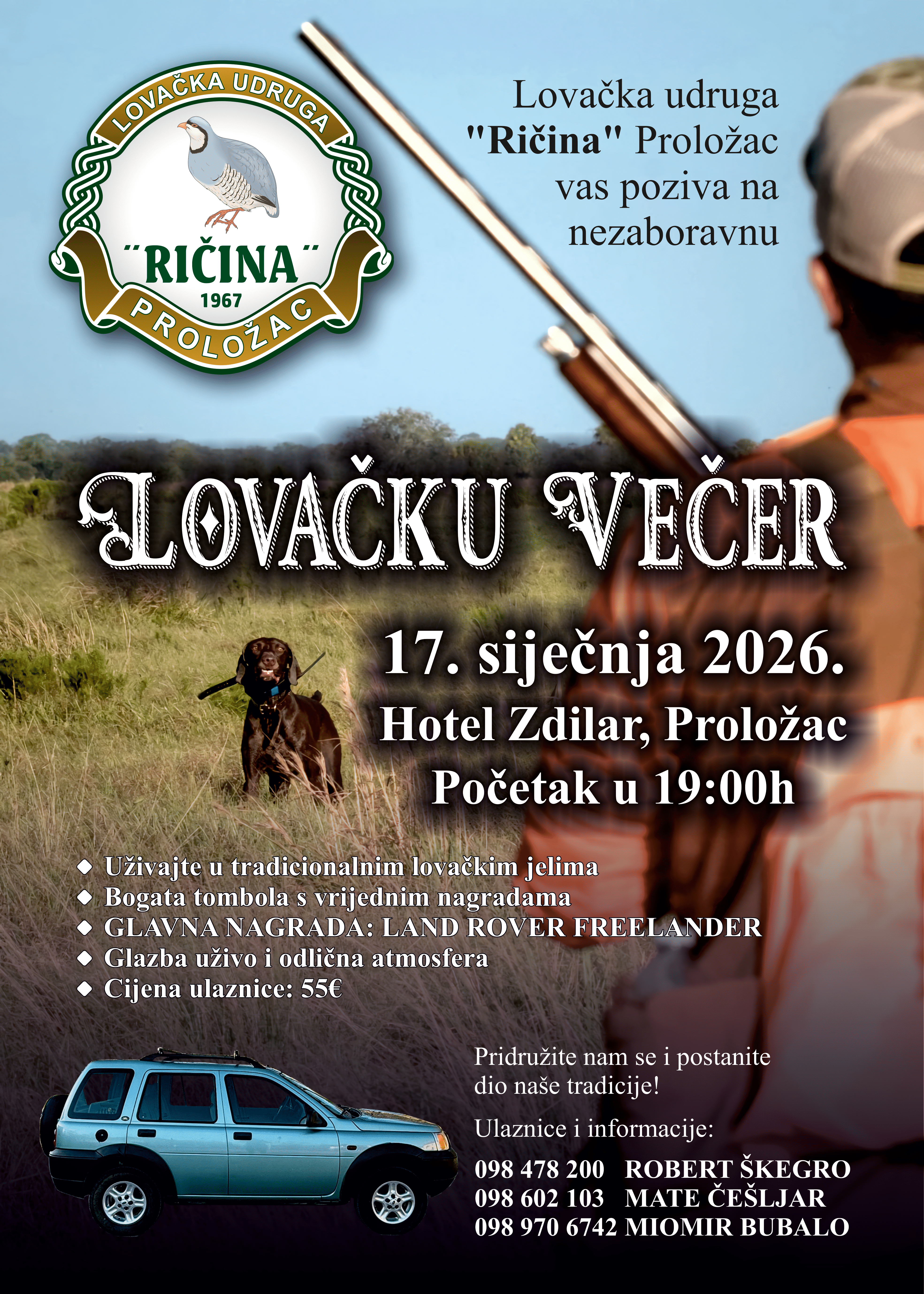 U subotu 17. siječnja s početkom u 19:00 sati u Hotelu Zdilar, Lovačka udruga Ričina Proložac organizira tradicionalnu Lovačku večer. Očekuje se dolazak brojnih uzvanika, članova udruge i gostiju, a organizatori poručuju kako su ulaznice još uvijek dostupne i mogu se kupiti danas i sutra. Lovačka večer već godinama predstavlja jedan od najvažnijih društvenih događaja u Prološcu i okolici, okupljajući ljubitelje lovstva, tradicije i dobre gastronomije. Posjetitelje očekuje bogata večera s tradicionalnim lovačkim jelima, ugodna atmosfera, glazba uživo te bogata tombola s vrijednim nagradama, među kojima se ističe i glavna nagrada večeri. Posebnu pažnju izaziva glavna nagrada večeri automobil Land Rover Freelander, koji će biti izvučen u tomboli, što dodatno povećava interes za sudjelovanje na ovogodišnjoj Lovačkoj večeri.