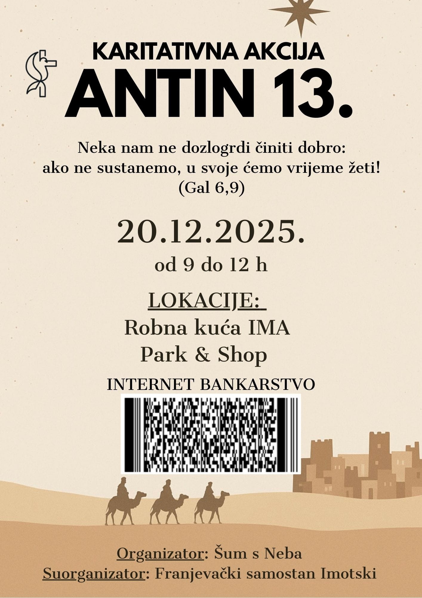 Na plakatu se nalazi QR kod za vas koji želite pomoći akciju internet bankarstvom. Također na štandovima će biti mogućnost ostaviti kune koje vrijede još do kraja godine u sklopu Caritasove akcije “Spasi kunu od propasti, daruj je za 1000 radosti.” "Veselimo se susretu s vama u subotu i oplemenjivanju jedni drugih u služenju trenutno najpotrebitija", poručili su organizatori. “Nosite jedni bremena drugih i tako ćete ispuniti zakon Kristov!” (Gal 6,2)