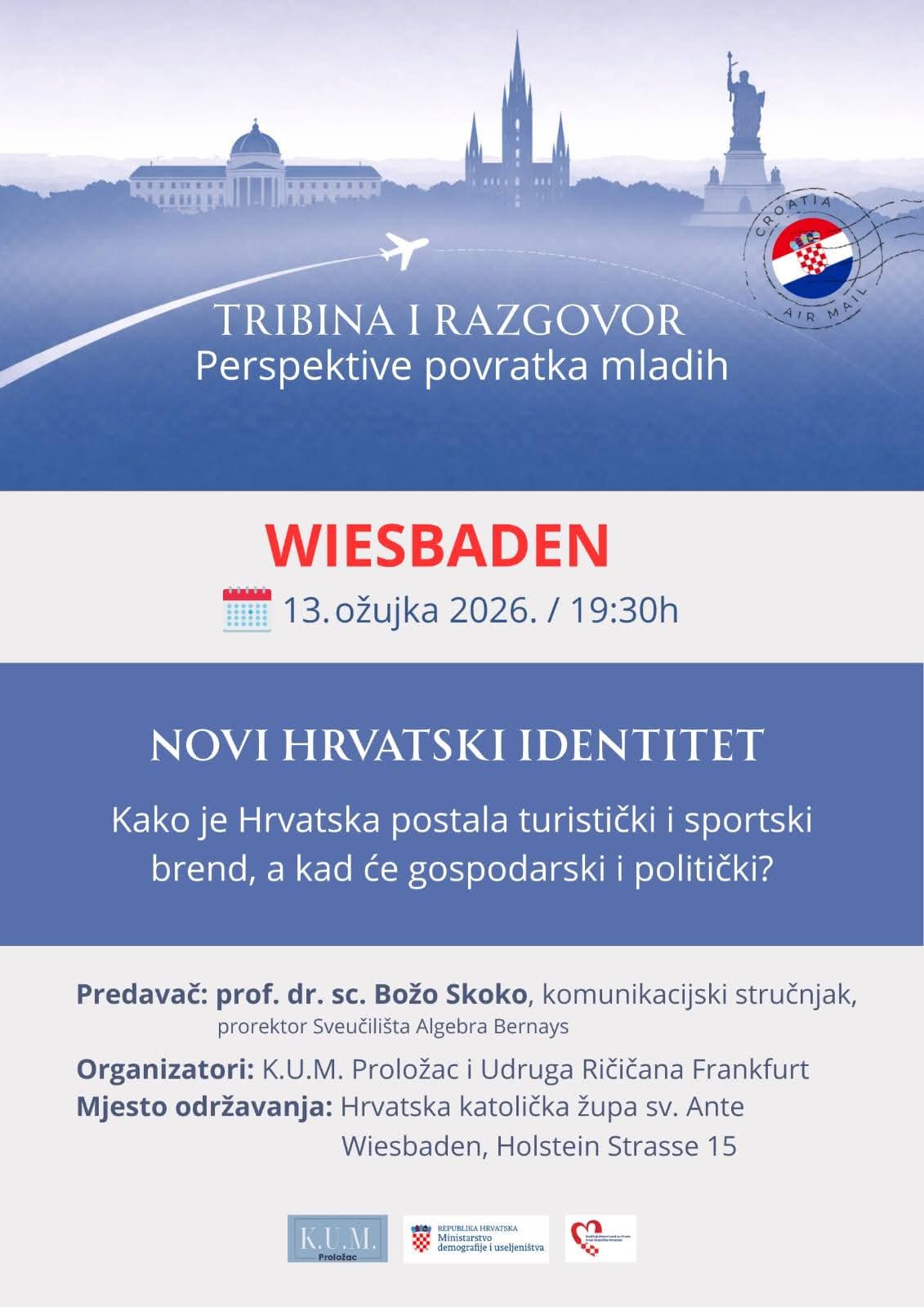 Udruga KUM Proložac i komunikacijski stručnjak Božo Skoko sljedećeg će tjedna u Njemačkoj održati niz aktivnosti namijenjenih hrvatskoj dijaspori, i to u Wiesbadenu i Münchenu, uz potporu partnerskih organizacija.