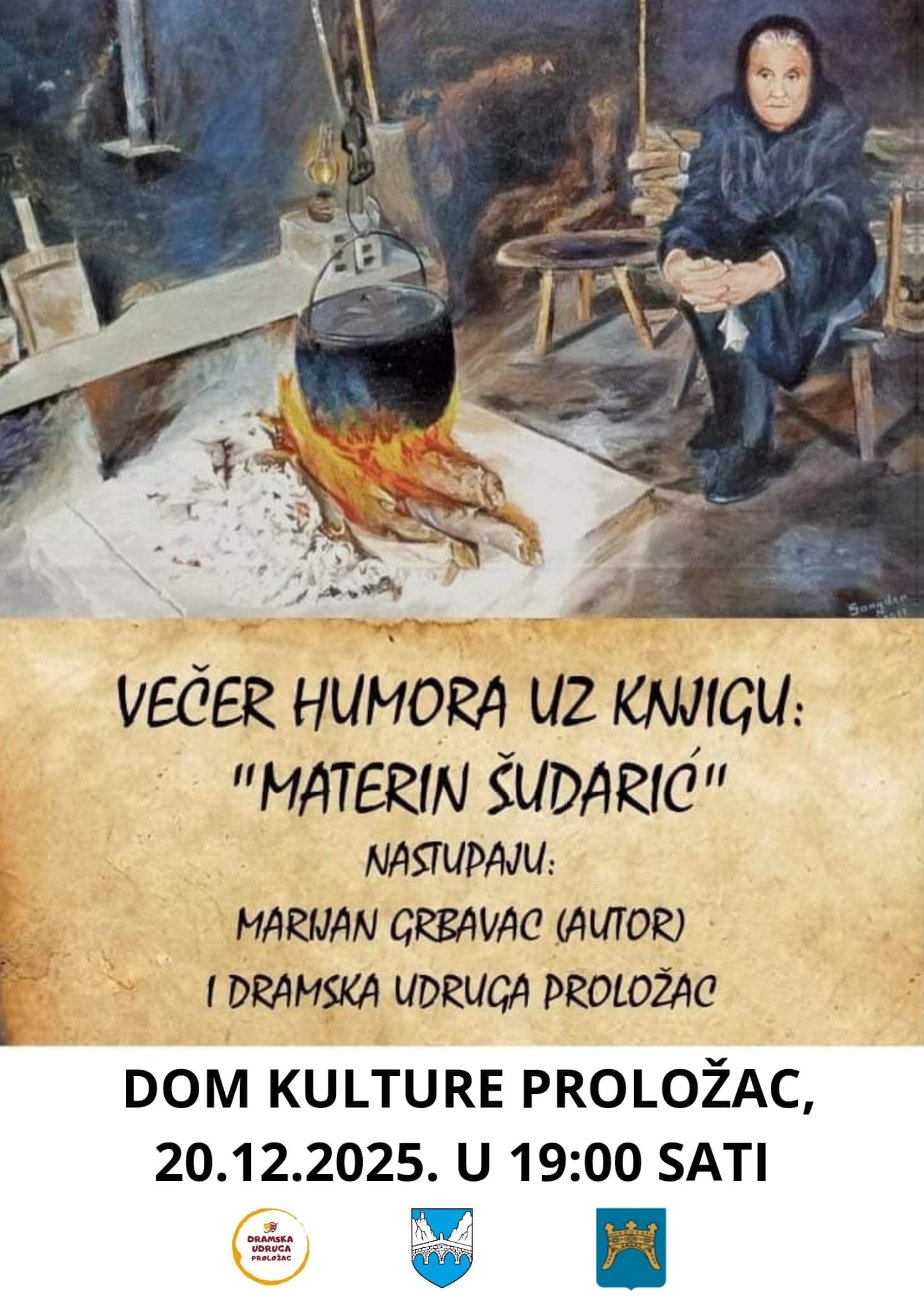 Večer humora uz knjigu "Materin šudarić" u izvedbi Marijana Grbavca Mirića – autora i majstora živog humora i Dramske udruge Proložac – ekipe koja jamči smijeh do suza, održat će se u subotu, 20. prosinca 2025. s početkom u 19:00 sati u Domu kulture Proložac. Dođite i uživajte u zdravom humoru.