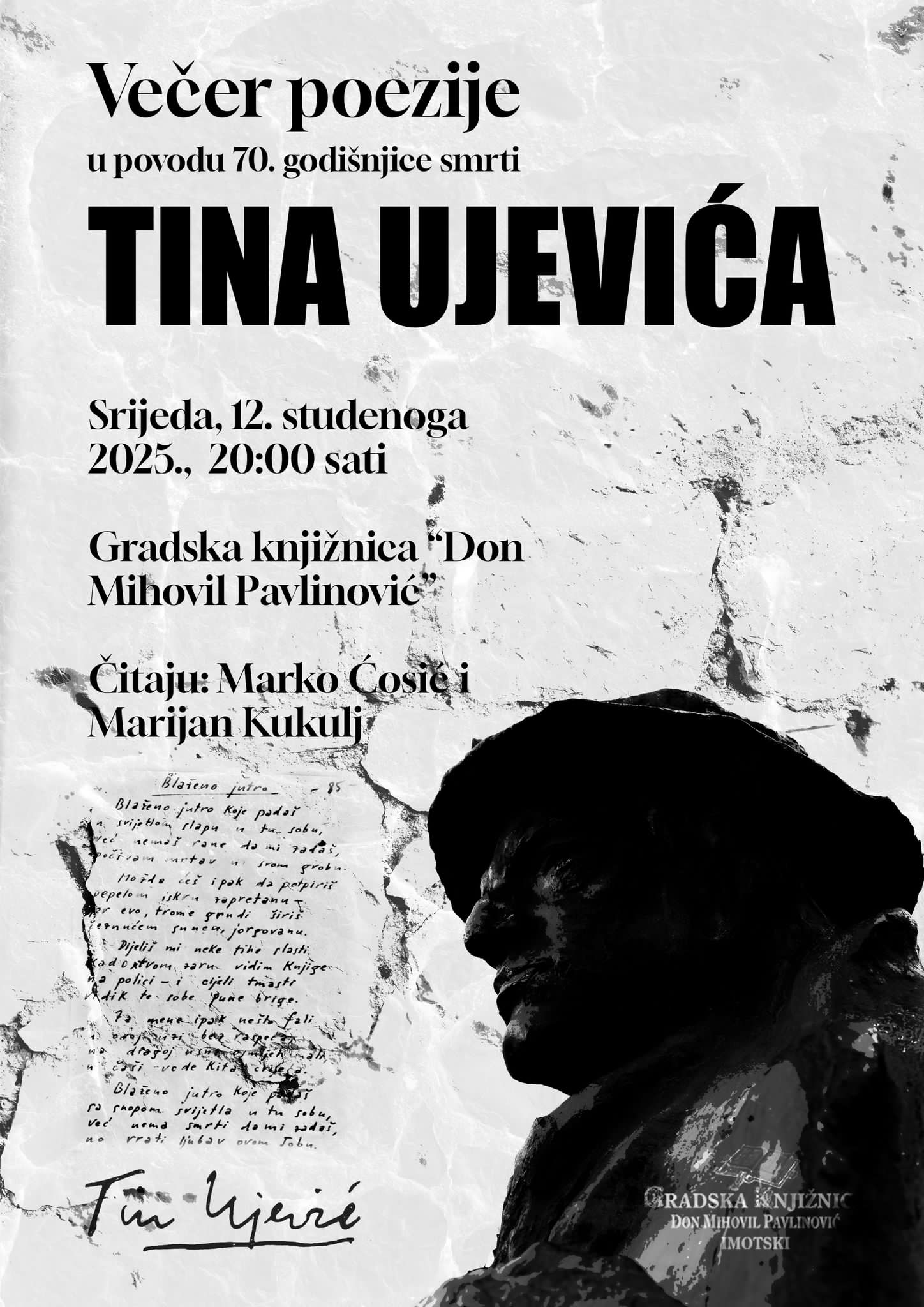 U srijedu 12. studenog s početkom u 20 sati u Gradskoj knjižnici "Don Mihovil Pavlinović" Imotski, održat će se večer poezije u povodu 70. godišnjice smrti jednog od najvećih hrvatskih pjesnika Tina Ujevića. Njegove bezvremenske stihove čitat će Marko Ivan Ćosić i Marijan Kukulj.