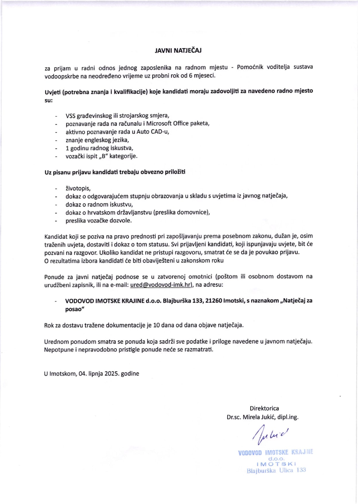 Vodovod Imotske krajine objavio je javni natječaj za prijam u radni odnos na neodređeno vrijeme, jednog zaposlenika na radno mjesto - pomoćnik voditelja sustava vodoopskrbe. Više detalja pročitajte ispod: