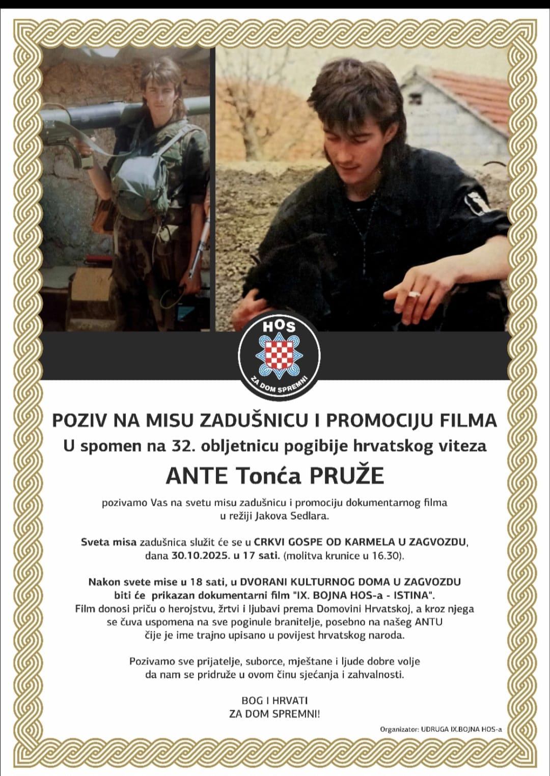 Nakon svete mise u dvorani Kulturnog doma u Zagvozdu bit će prikazan dokumentarni film "IX. Bojna HOS-a - ISTINA". Film donosi priču o herojstvu, žrtvi i ljubavi prema Domovini Hrvatskoj, a kroz njega se čuva uspomena na sve poginule branitelje, posebno na Antu čije je ime upisano u povijest hrvatskog naroda.